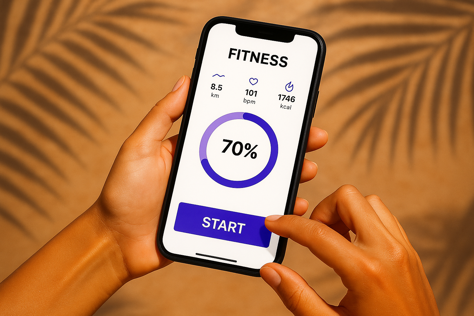A mobile interface showcasing a fitness tracking application, featuring statistics such as distance, heart rate, and calories burned. The modern design is suitable for health and wellness marketing.