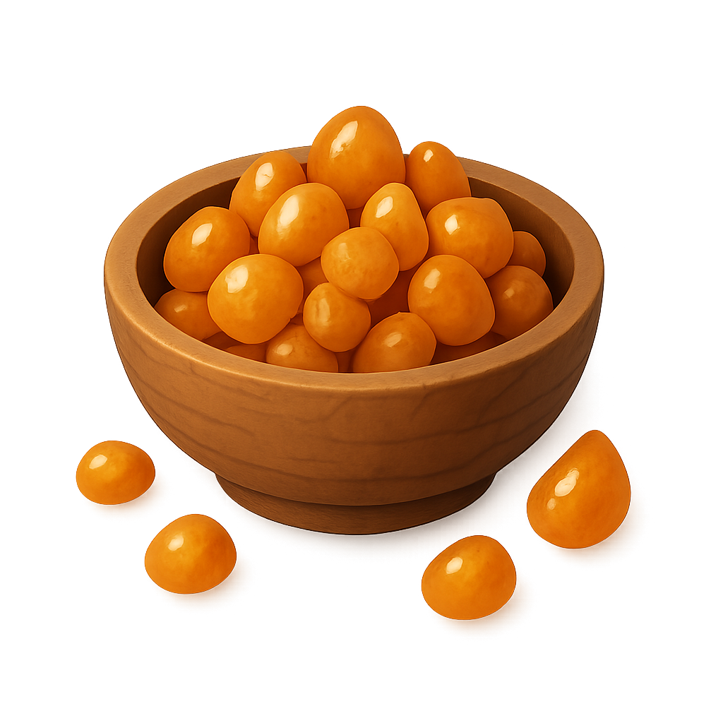 A detailed 3D rendering of a wooden bowl filled with shiny golden orbs. Several orbs are scattered around the bowl, creating an inviting and vibrant appearance.