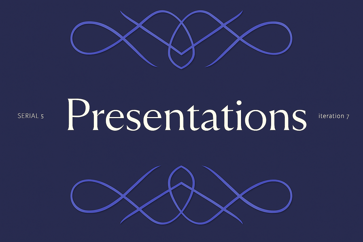 /Collection: /by davooda/Type: PNG/This image features a refined portfolio design showcasing the word 'Presentations' in elegant typography, complemented by intricate patterns and a deep blue background.