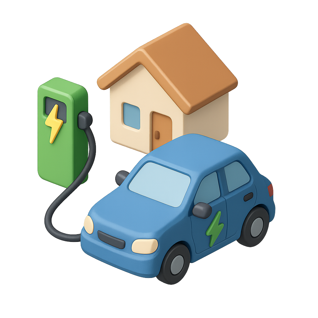 A 3D icon depicting an electric vehicle charging at home. The scene includes a blue car with a lightning bolt symbol, a green charging station, and a cozy house.