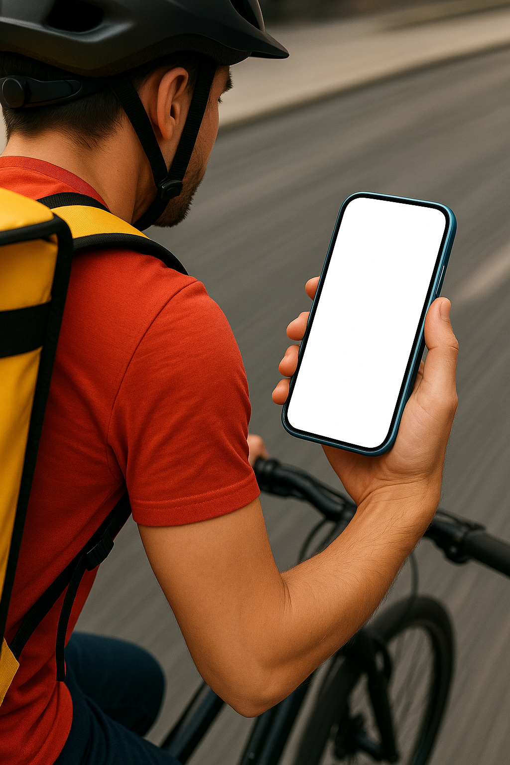 A courier in a red shirt and backpack rides a bicycle, holding a blue phone with a blank screen. The image captures a dynamic view from behind, emphasizing movement.