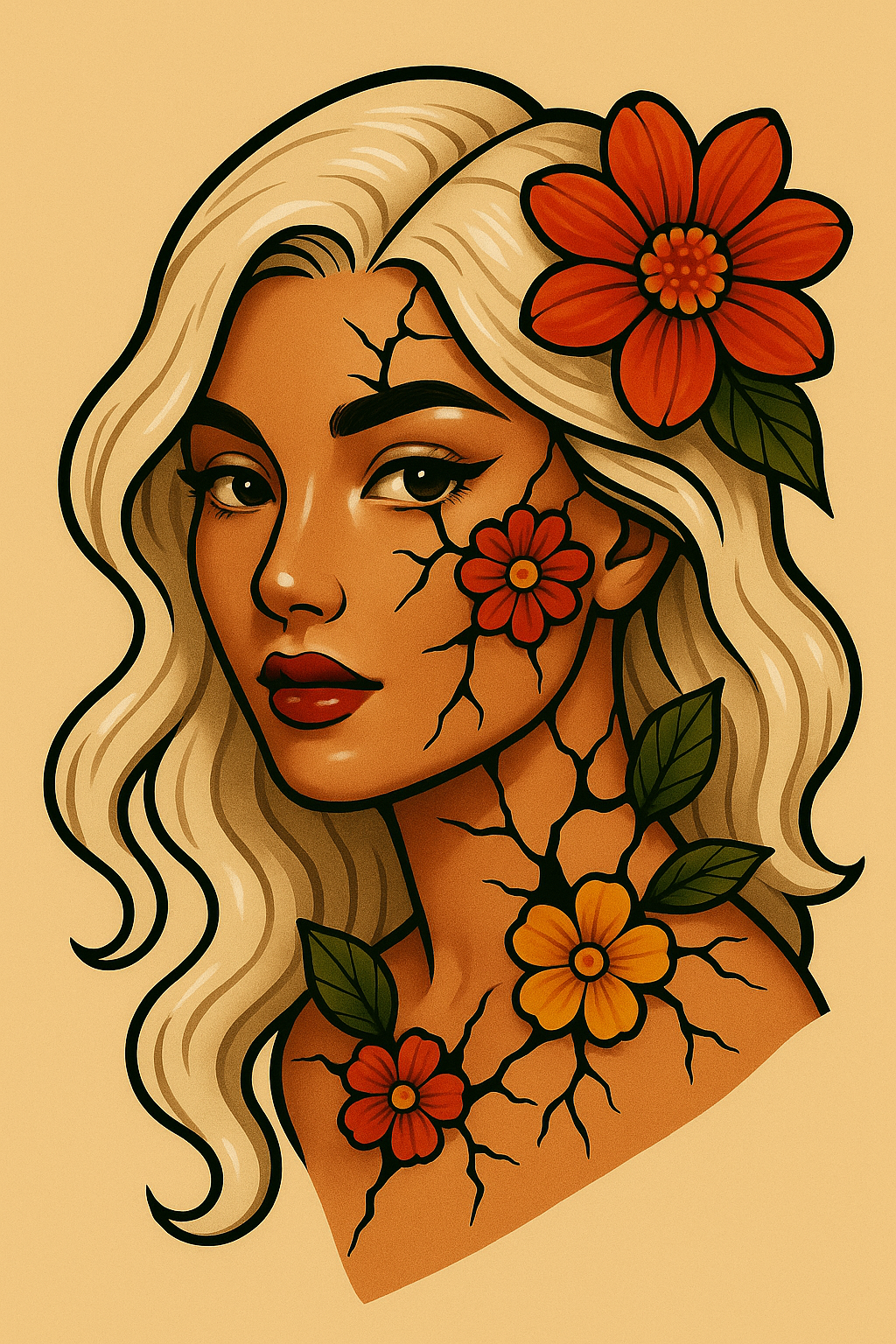 A striking illustration of a girl featuring intricate floral tattoos emerging from cracks on her skin. Her white hair contrasts beautifully with the warm beige background.