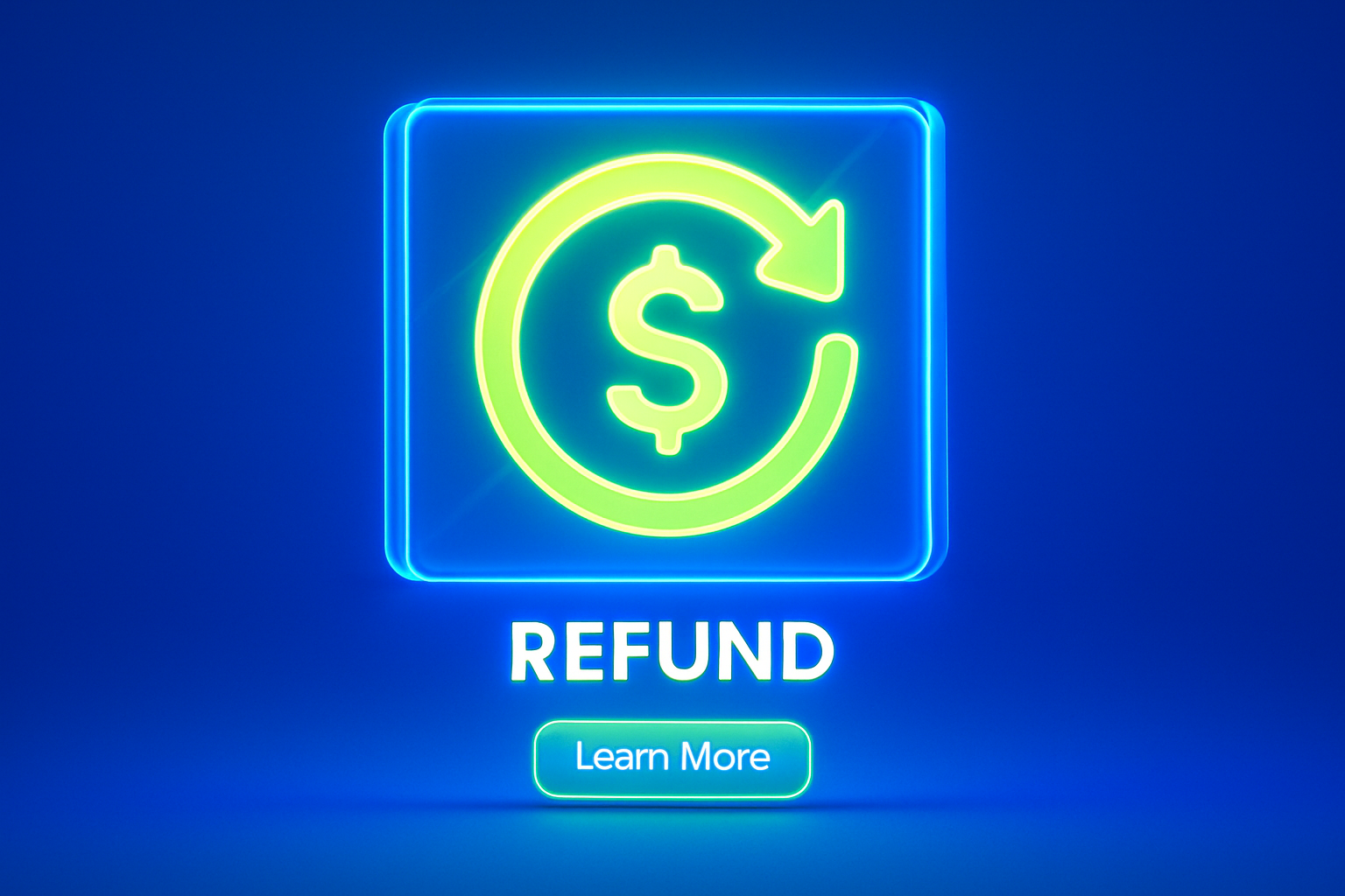 A glowing refund symbol featuring a dollar sign and circular arrow in neon yellow-green, set on a solid blue background. Includes a call-to-action button.