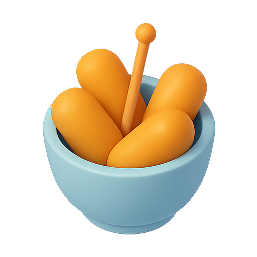 A modern and playful graphic featuring a light blue bowl filled with orange snacks and a matching utensil, ideal for food-related designs.