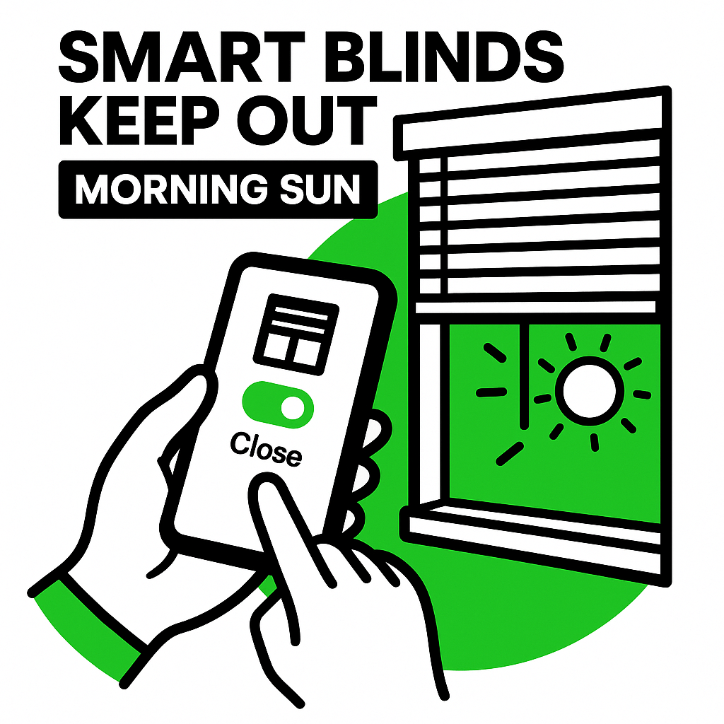 A modern graphic illustrating smart blinds that can be controlled via a mobile device, designed to block morning sunlight. Ideal for smart home marketing.