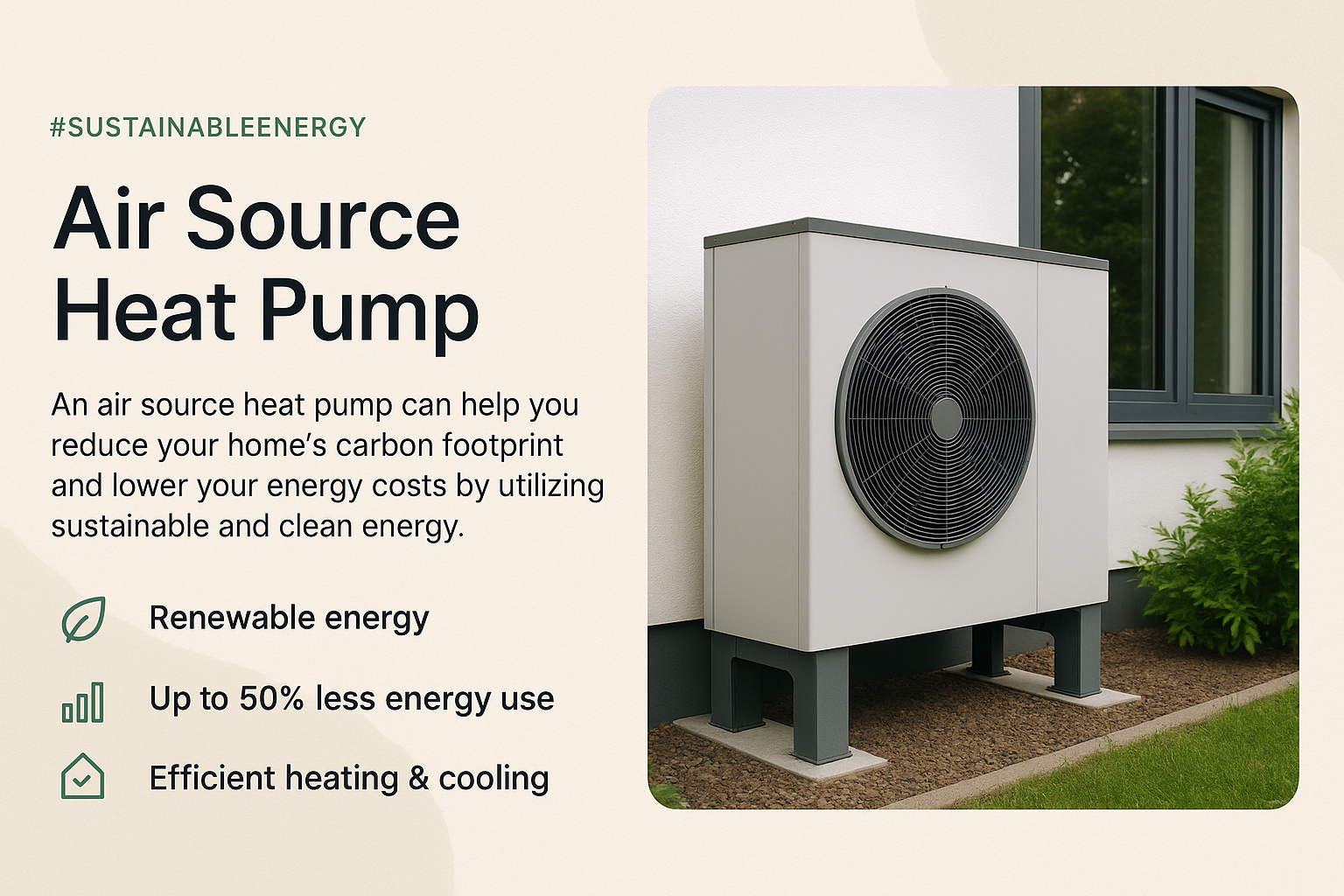 Educational image showcasing an air source heat pump with text highlighting its benefits, perfect for promoting renewable energy solutions to homeowners.