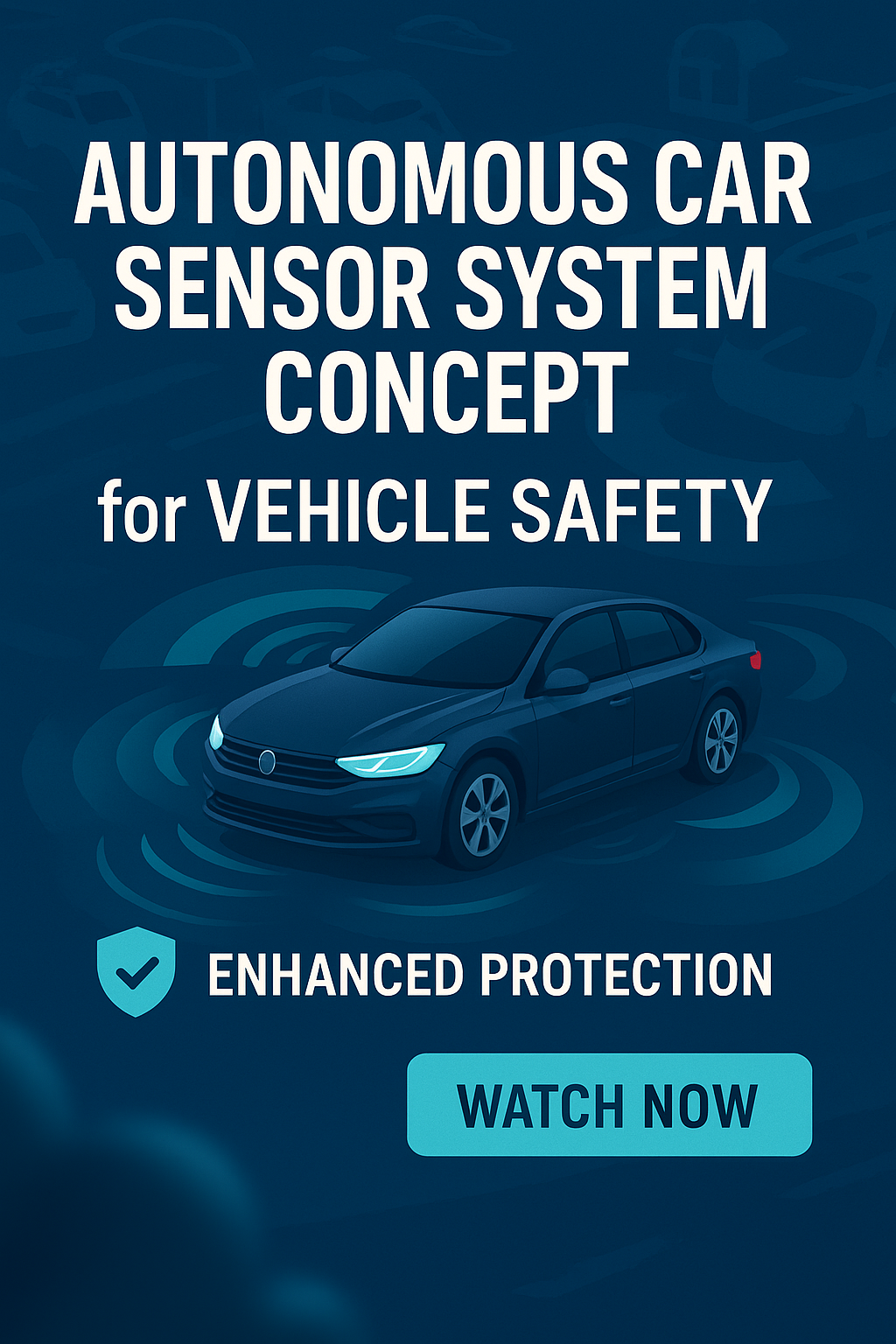 Informative graphic showcasing an autonomous car sensor system concept, emphasizing vehicle safety with modern design elements suitable for tech promotion.