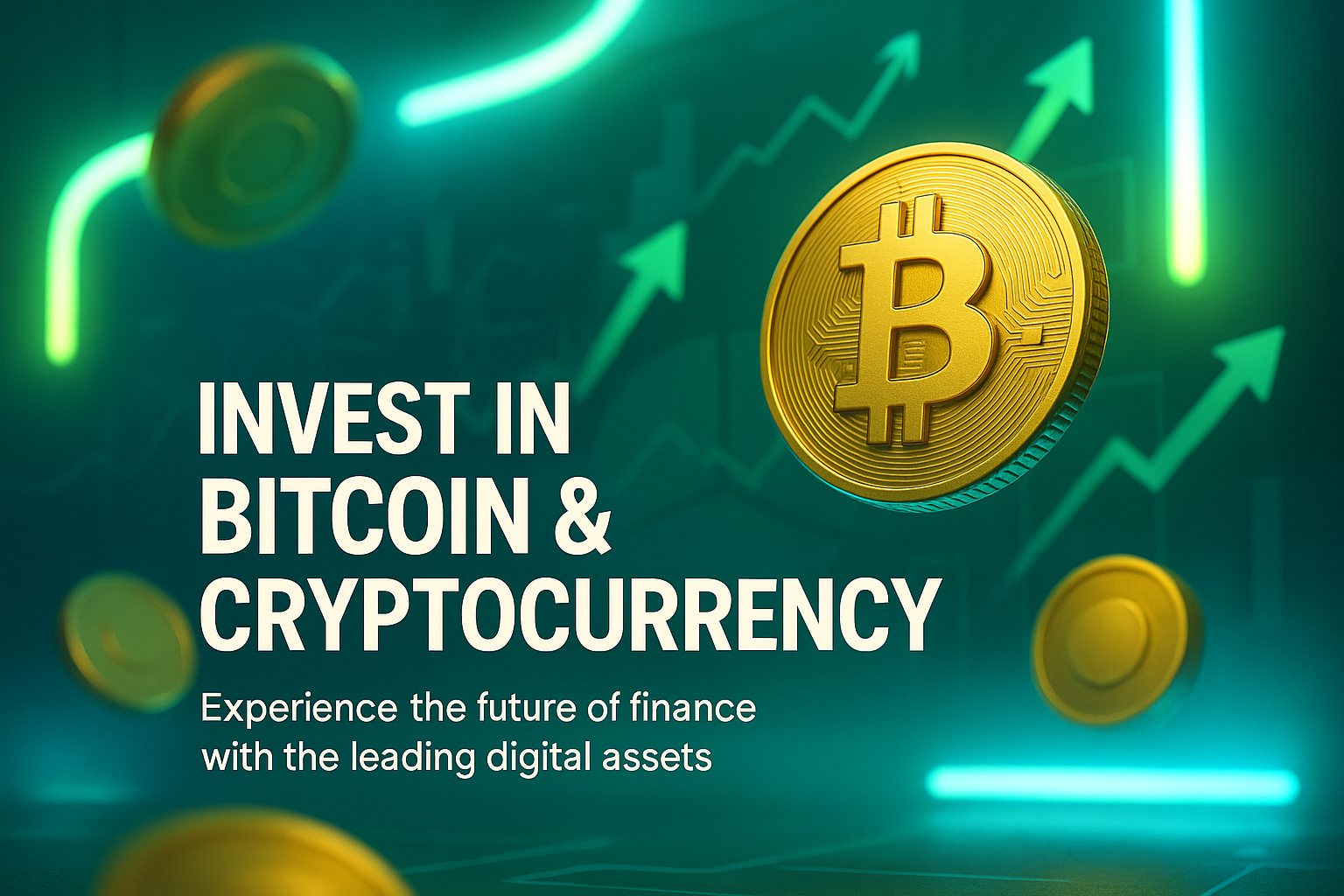 Dynamic promotional image highlighting Bitcoin and cryptocurrency investment opportunities, featuring modern design elements and vibrant colors to attract potential investors.