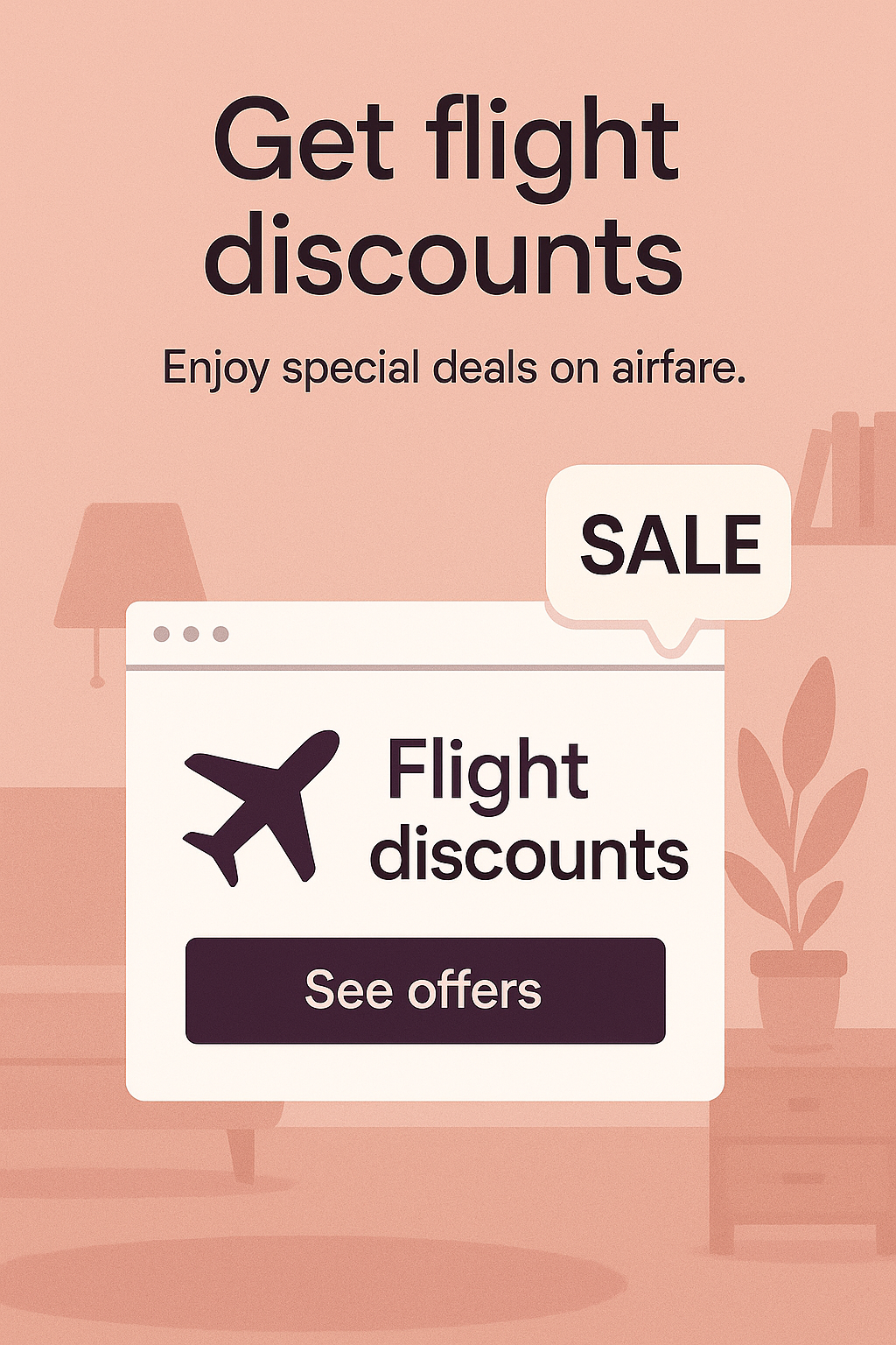 Digital promotional graphic highlighting flight discounts with a modern design, ideal for travel agencies or airlines targeting customers seeking airfare deals.