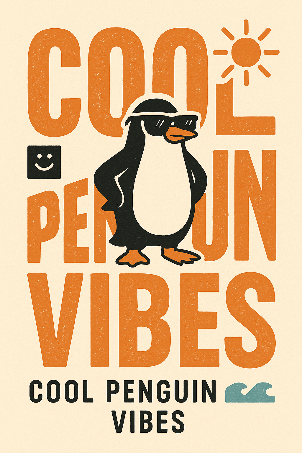 A vibrant graphic featuring a cartoon penguin wearing sunglasses, accompanied by bold typography. Ideal for social media or merchandise aimed at a youthful audience.