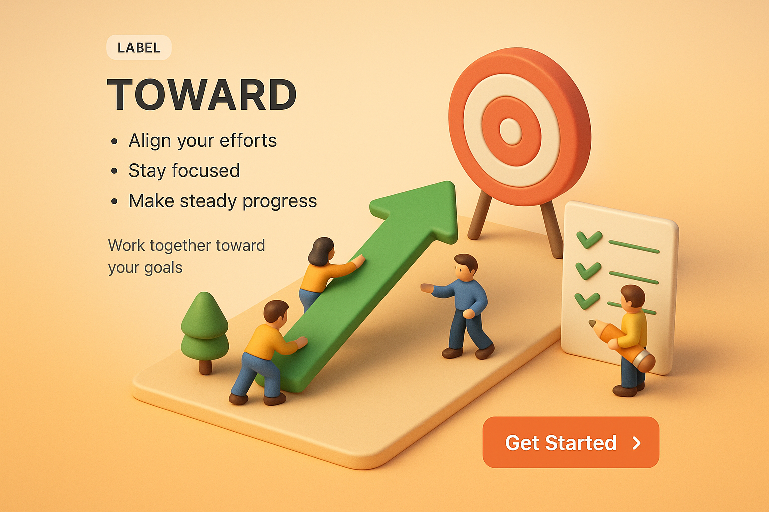 A vibrant 3D illustration depicting small characters focused on progress. They interact with an upward arrow and a target symbol, set against a smooth gradient background.