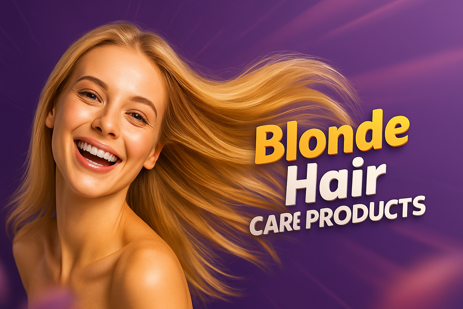 Dynamic Blonde Hair Care Products Banner with Smiling Woman