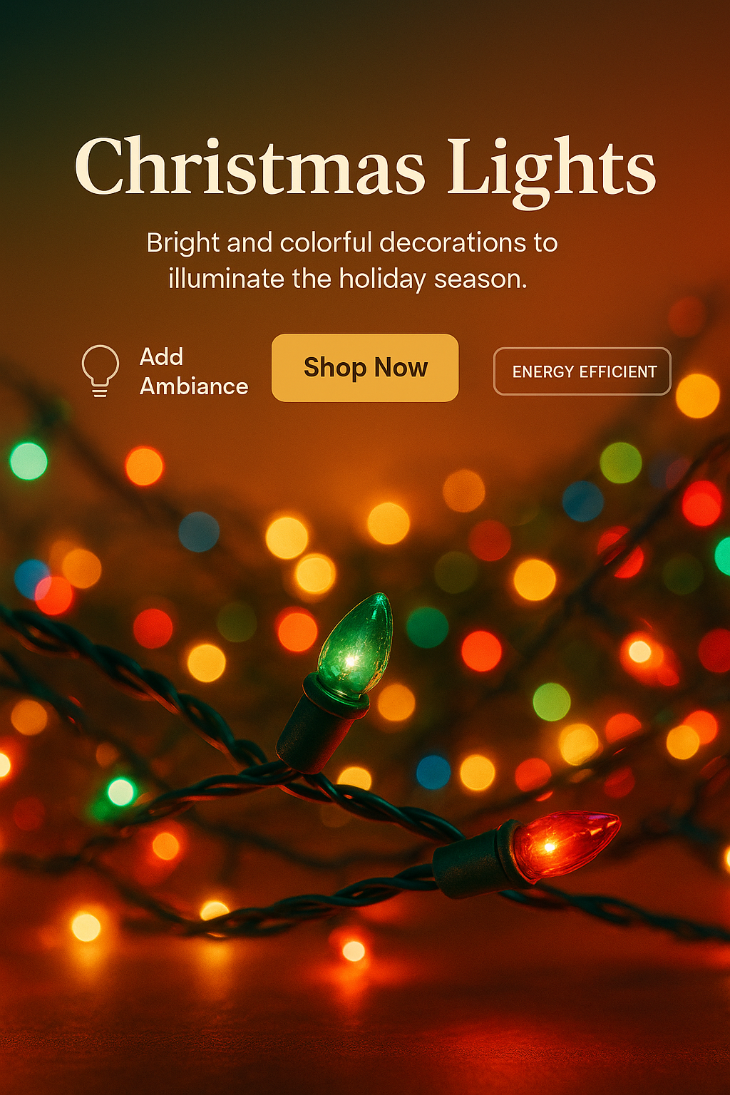 A vibrant banner showcasing colorful Christmas lights, emphasizing their role in holiday decoration and ambiance. Ideal for retail promotion during the festive season.