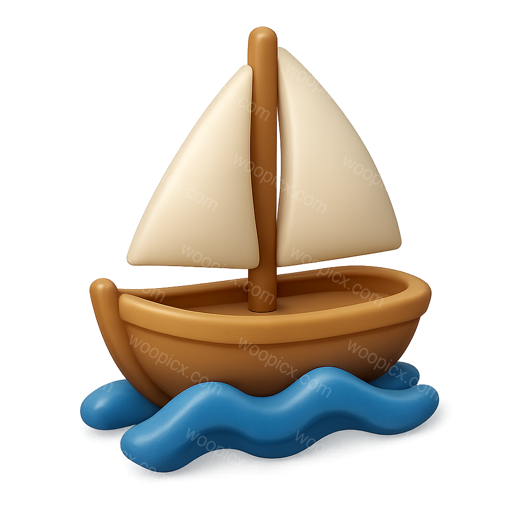 A stylized 3D sailboat icon with a wooden hull and white sail, appearing on waves. The design features a transparent background and a three-quarter isometric view, showcasing depth.