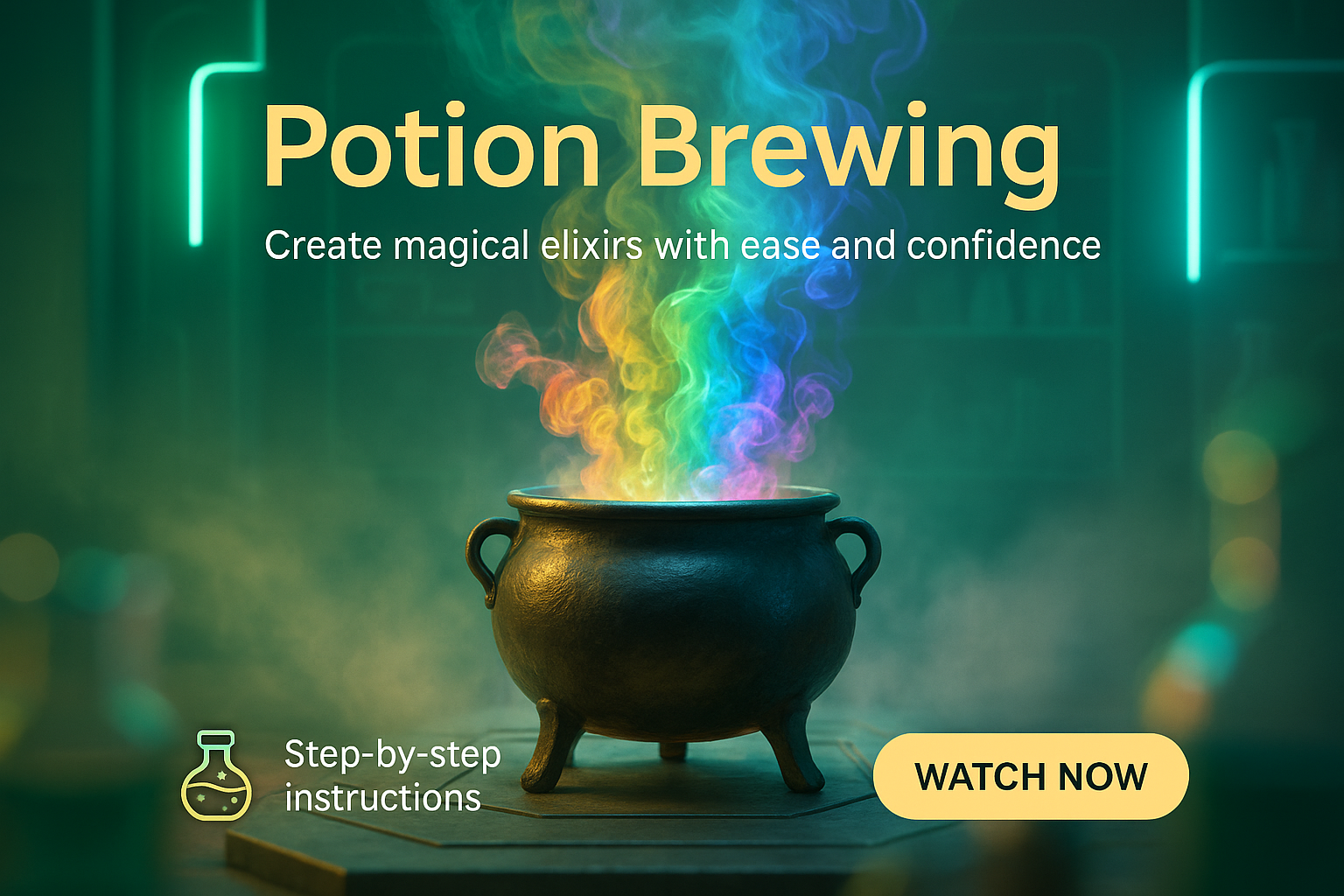 A captivating promotional graphic for potion brewing featuring a mystical cauldron emitting colorful steam, ideal for an online tutorial or magical-themed content.