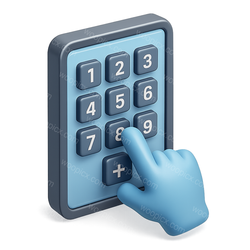 /Premium/Collection: /by davooda/Type: PNG/A 3D rendered touchscreen keypad featuring digits 0-9 and a plus sign. A hand interacts with the keypad, showcasing a modern design with a three-quarter view and isometric perspective.
