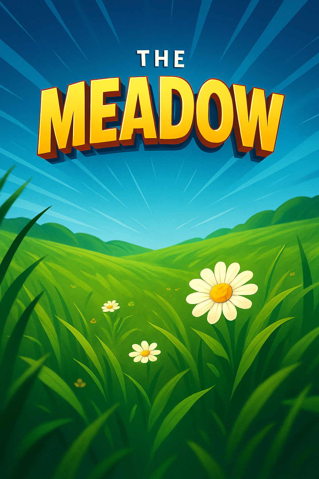 A colorful illustration of a meadow featuring vibrant grass, flowers, and dynamic rays of light. The title 'THE MEADOW' is prominently displayed with a bold font.