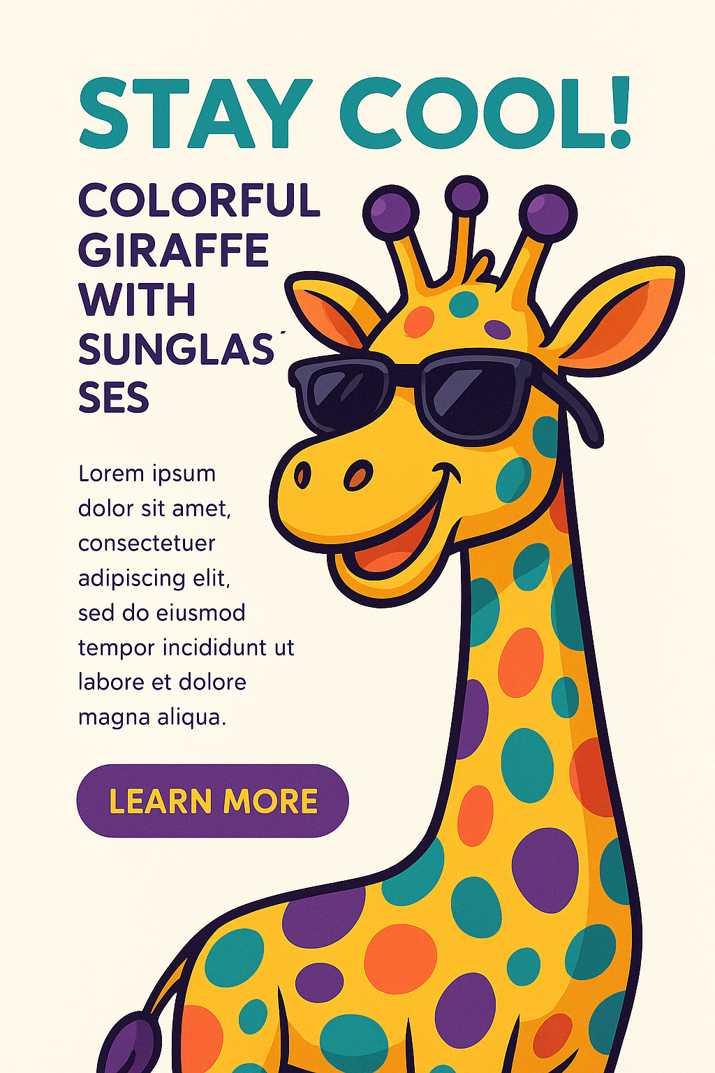 Vibrant and playful illustration of a giraffe wearing sunglasses, perfect for children's content or marketing. Features bright colors and fun design elements.