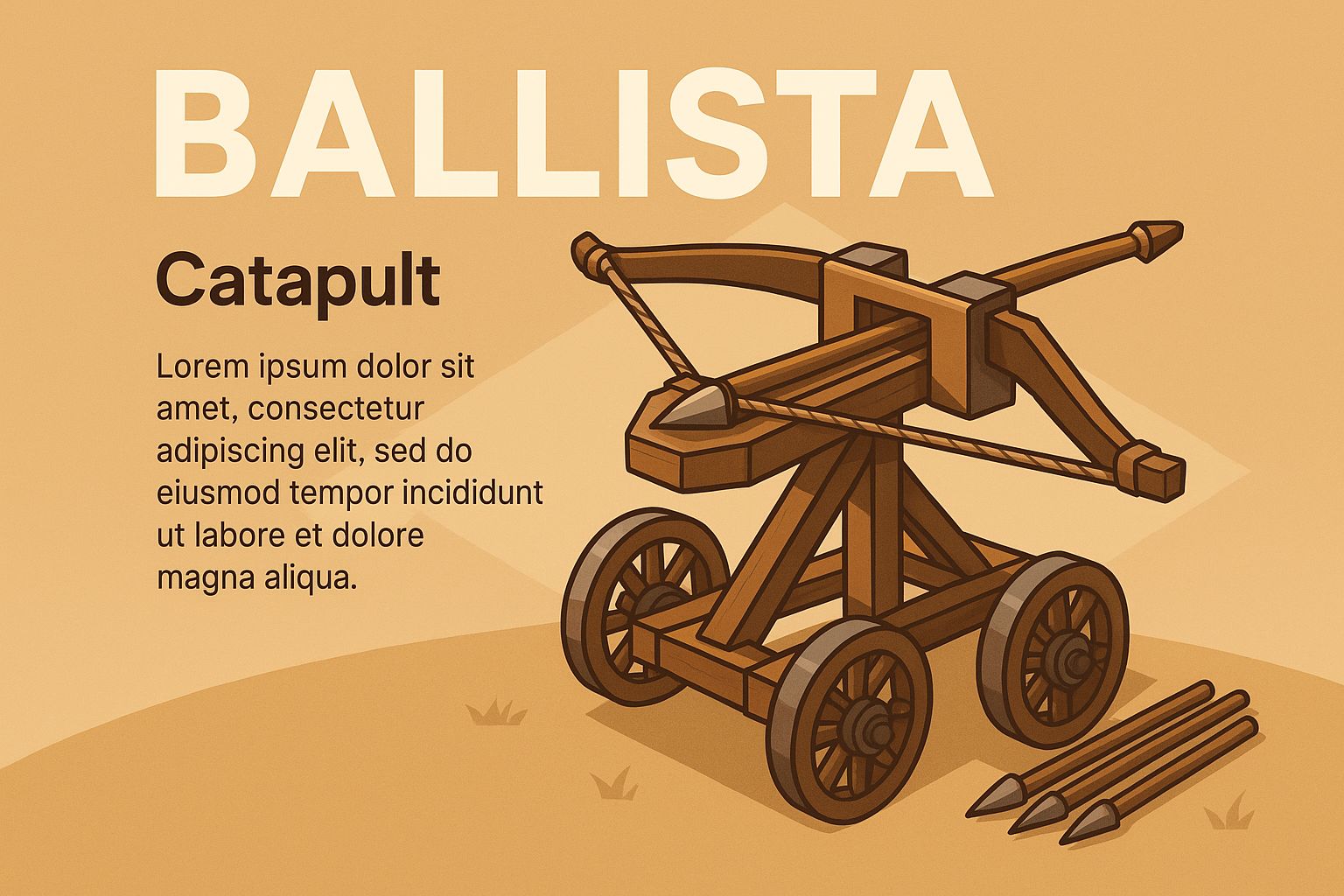 /Collection: /by davooda/Type: PNG/An artistic depiction of a ballista catapult featuring a wooden structure with wheels and bolts. The background is a simple gradient, creating a layered visual effect. Text includes the title 'BALLISTA' and a placeholder description.