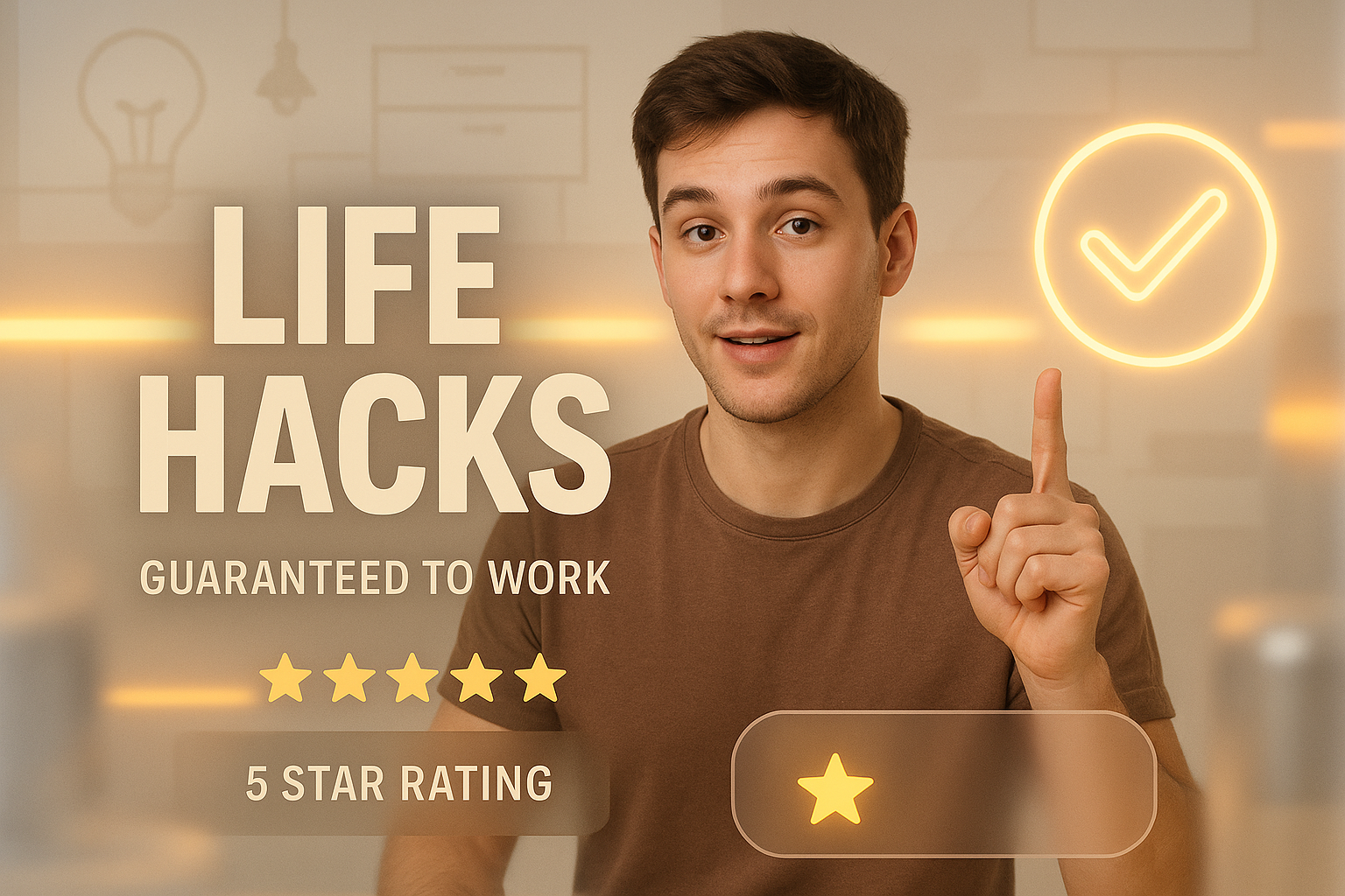 /Collection: /by davooda/Type: PNG/Informative graphic showcasing life hacks with a confident presenter, featuring a five-star rating system and modern design elements suitable for social media promotion.