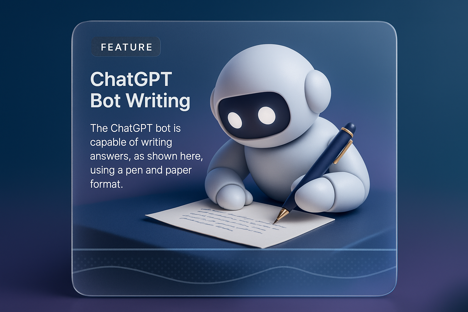 A 3D illustration featuring a ChatGPT bot writing answers using a pen on paper. The design includes a translucent block with a modern aesthetic, showcasing features clearly.