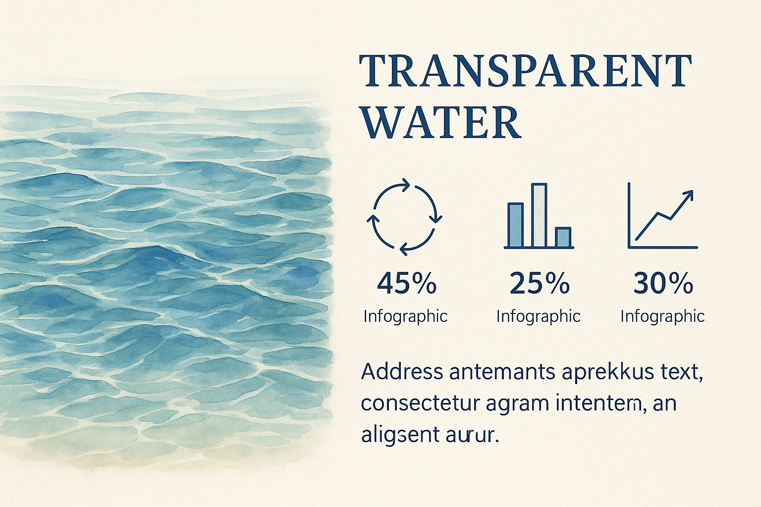 /Collection: /by davooda/Type: PNG/Visually appealing infographic focusing on transparent water, featuring data visualizations and watercolor style, suitable for educational or environmental awareness purposes.