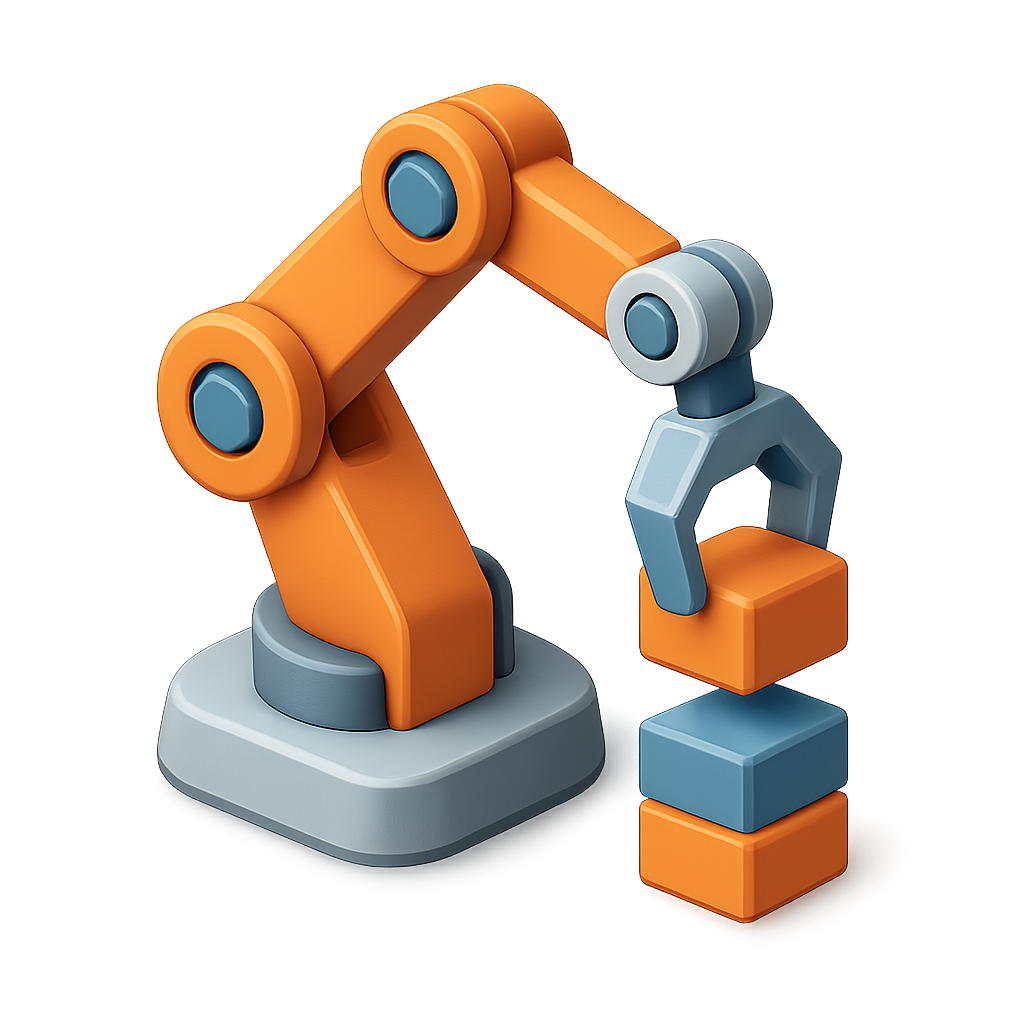 /Collection: /by davooda/Type: PNG/A stylized 3D icon of a robotic arm, featuring vibrant orange and gray colors. The arm is depicted in a three-quarter view, skillfully manipulating colored blocks, showcasing its functionality in a modern, isometric design.