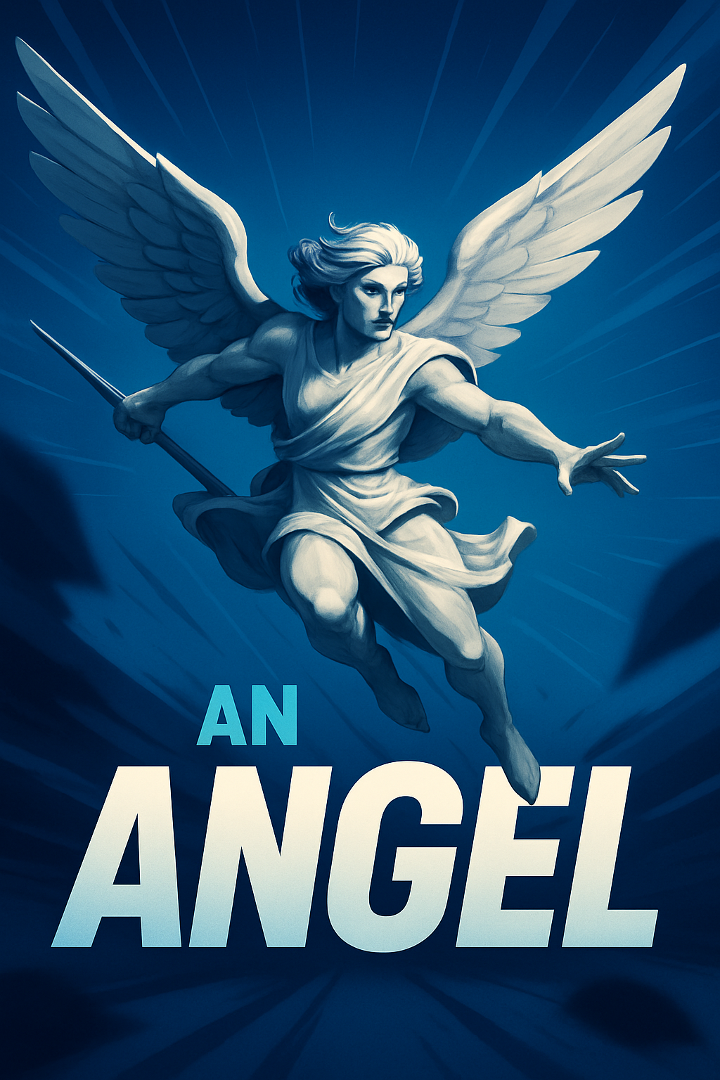 A striking 3D illustration of an angel in motion, featuring dynamic lines radiating from the center. The color palette is a blend of blue tones, creating a dramatic and engaging atmosphere.