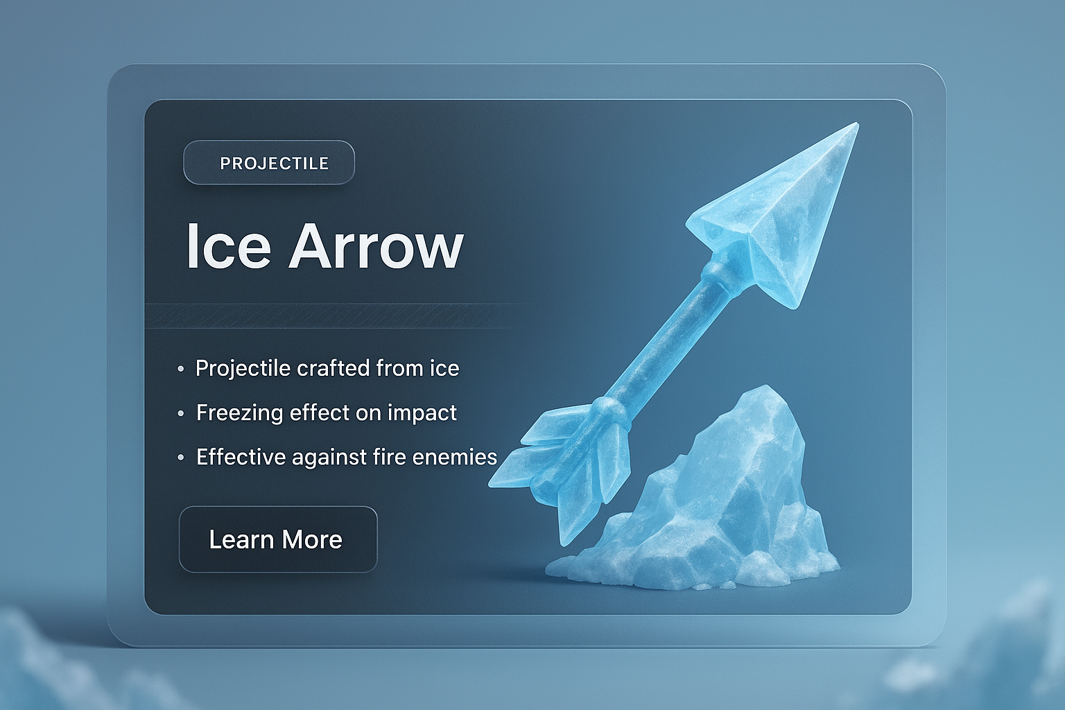 A captivating 3D illustration of an ice arrow, featuring a frosty design. The arrow rests on a mound of ice, with a sleek, modern label overlay that highlights its attributes.