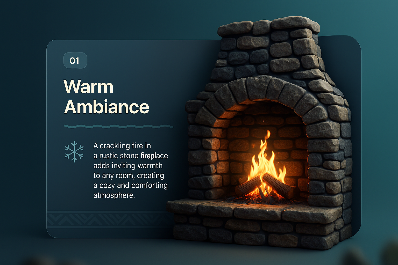 A cozy stone fireplace features a crackling fire, creating a warm and inviting atmosphere. The design includes a layered composition with a smooth gradient background.