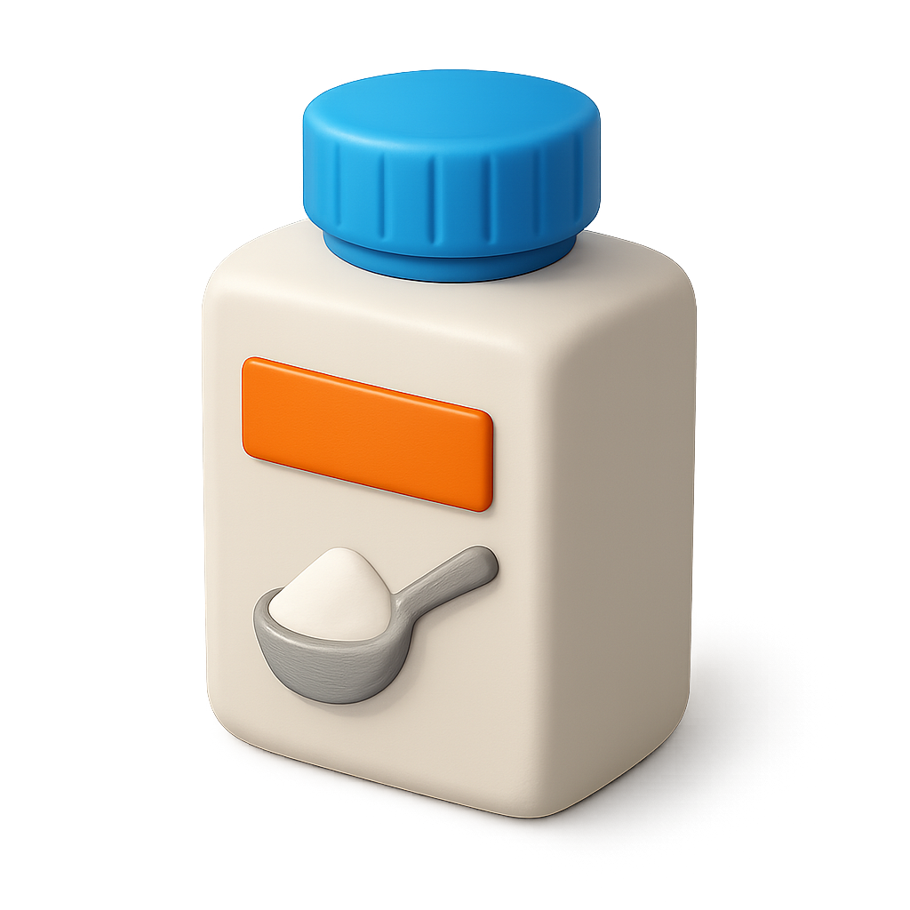 A three-dimensional icon of a bicarbonate container featuring a blue lid and an orange label. The design is isometric, showcasing a scoop of powder on the front.