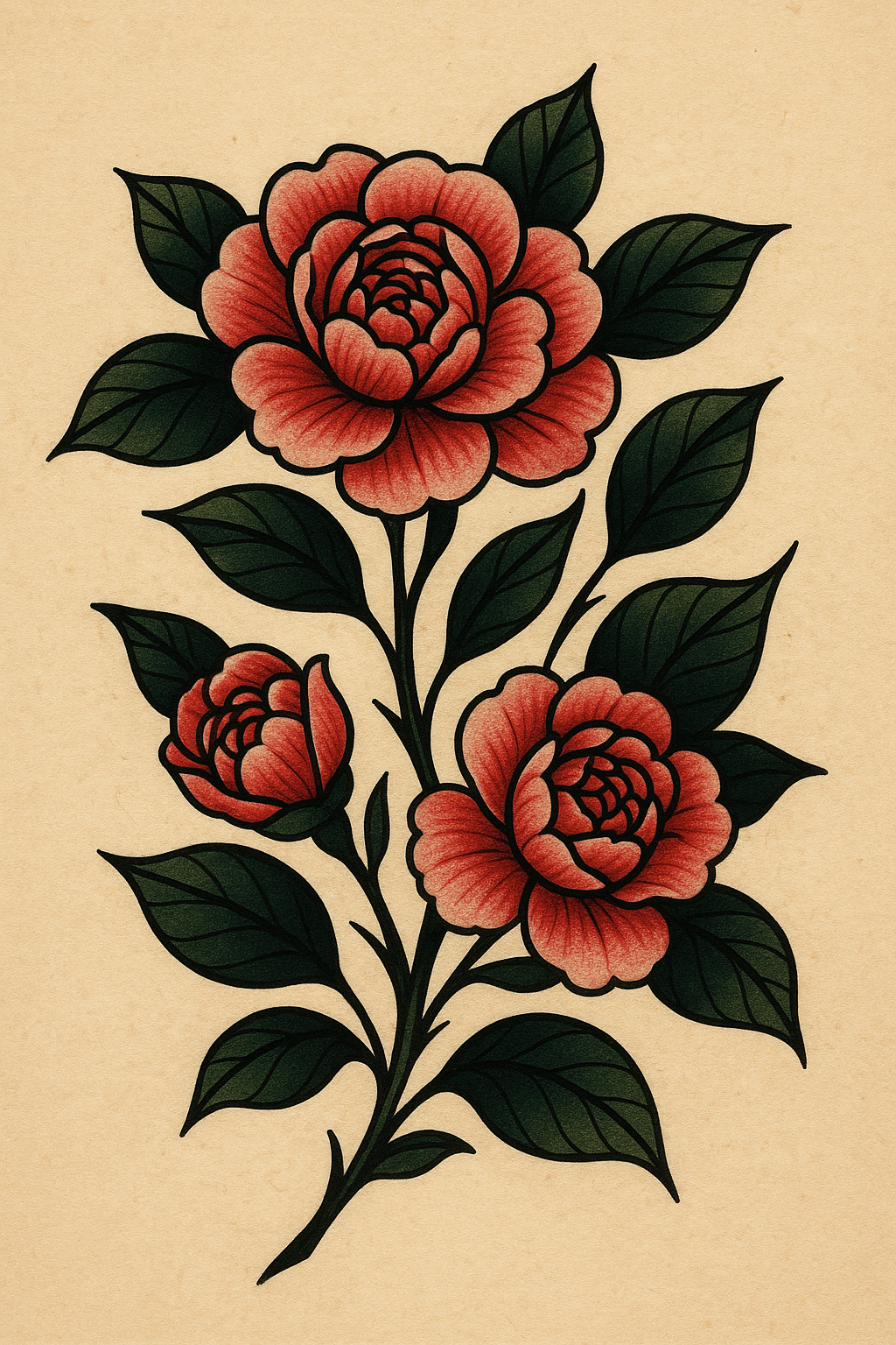 This image features a detailed illustration of roses with rich colors and intricate leaves, ideal for floral art, tattoo design, or print.