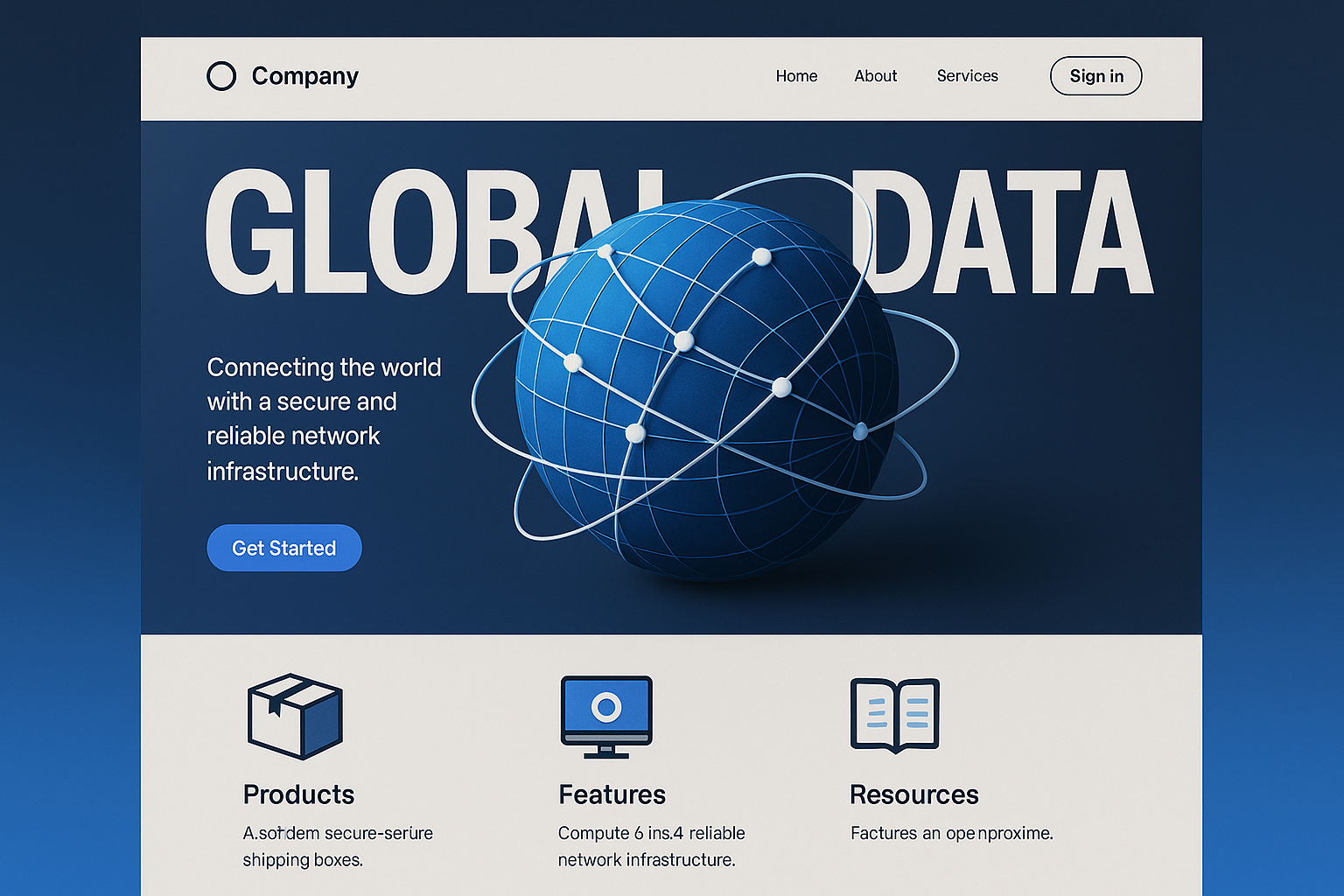 /Collection: /by davooda/Type: PNG/A modern and minimalistic landing page design featuring a 3D globe representing global data connectivity. The layout includes bold typography, interactive buttons, and sections for products and features.