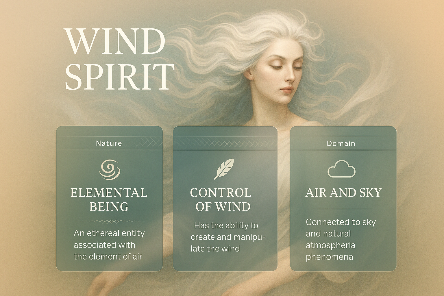 /Collection: /by davooda/Type: PNG/A captivating illustration of a wind spirit with informative blocks detailing its nature, control, and domain. The design features a light background with gradient tones, enhancing readability.