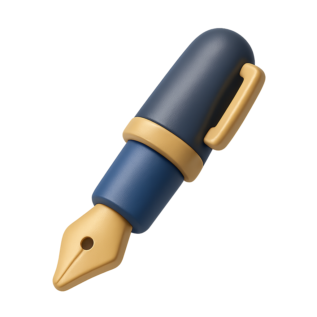 This image features a stylish 3D fountain pen icon, showcasing a blue and gold color scheme. The pen is viewed in a three-quarter isometric perspective against a transparent background.