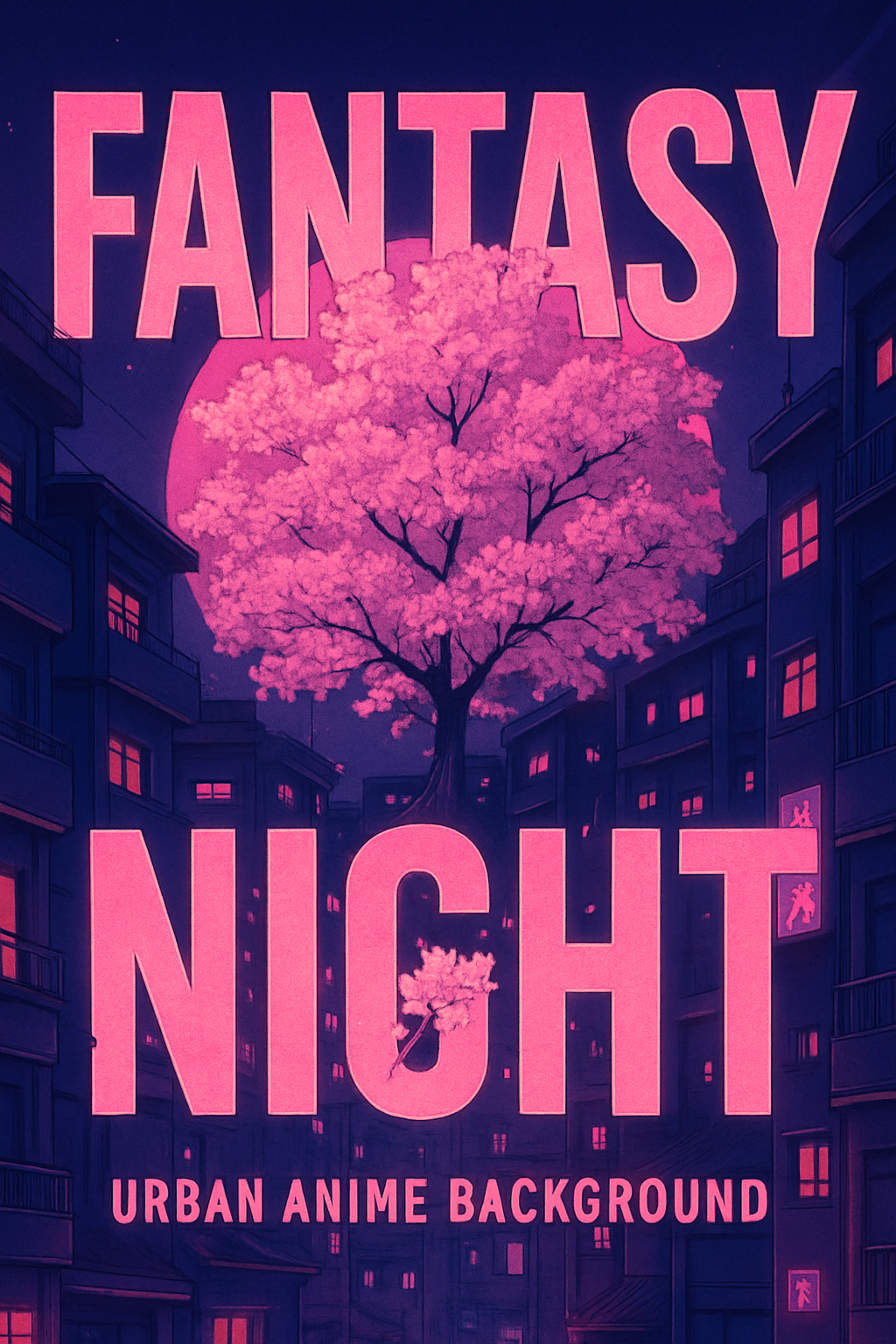 /Collection: /by davooda/Type: PNG/A visually striking urban fantasy background featuring a pink-hued tree against a night sky, designed in anime style. Ideal for digital art, gaming, or creative projects.