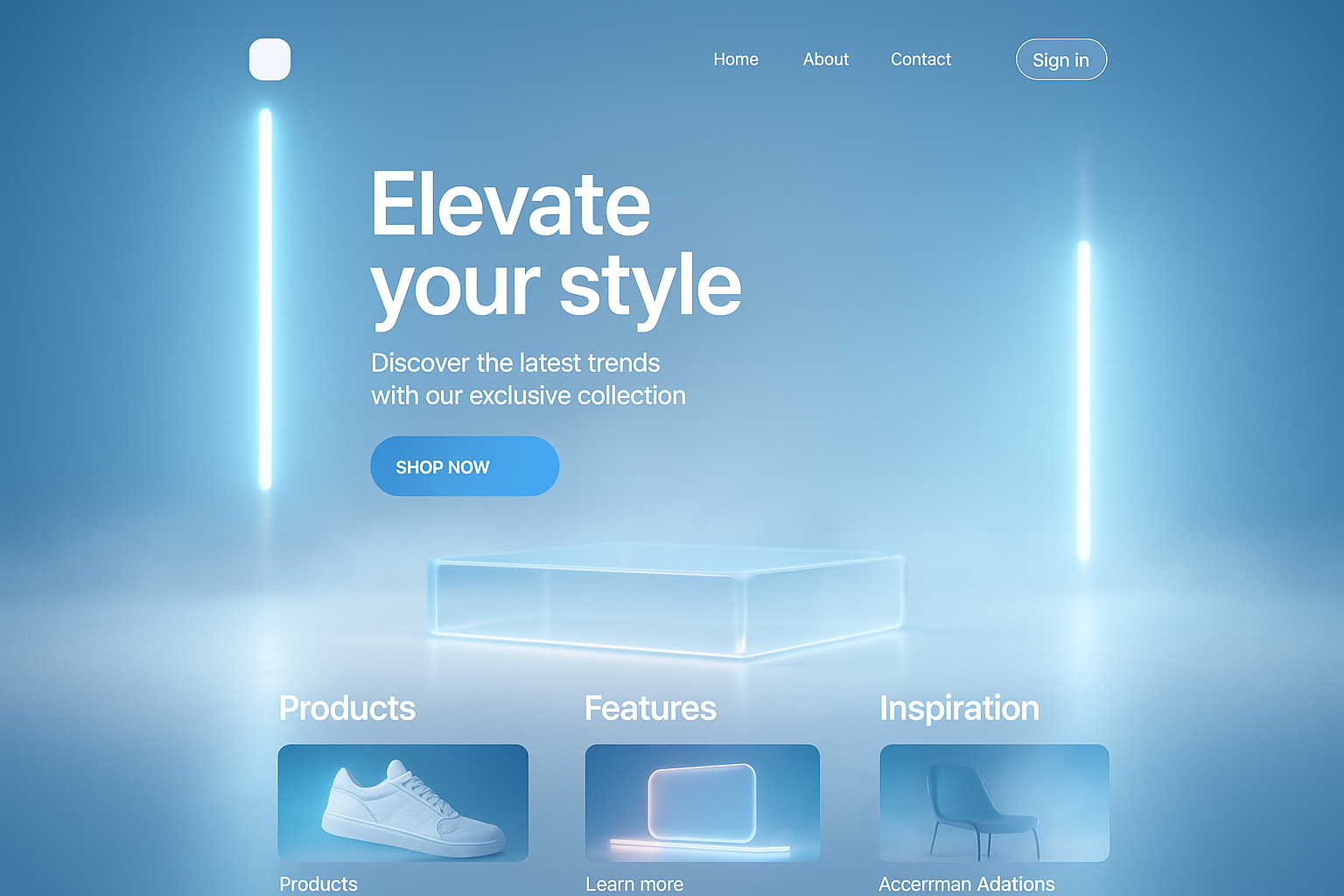 /Collection: /by davooda/Type: PNG/A vibrant, modern landing page featuring a blue-white gradient background, glowing neon accents, and sections for products, features, and inspiration. Elements are arranged for a sleek, engaging user experience.