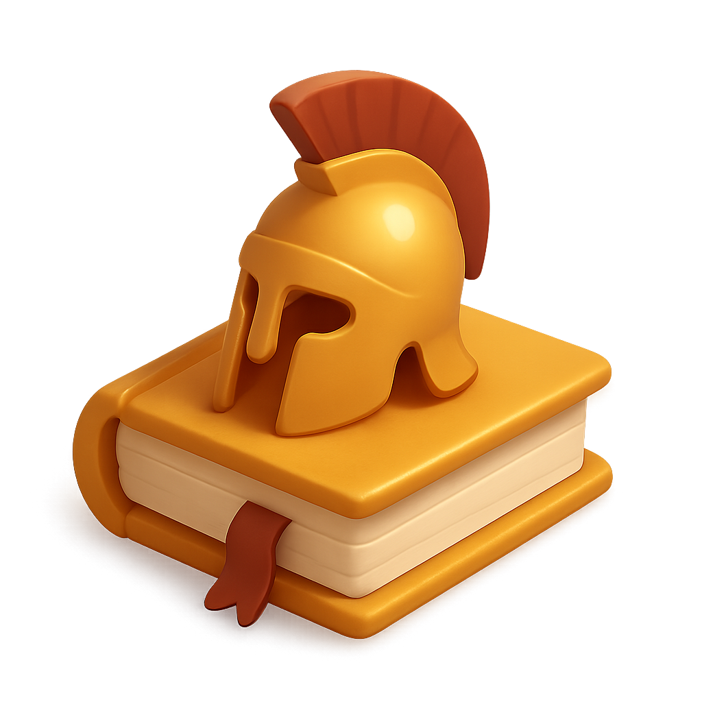 A creative 3D icon featuring a book with a golden Spartan helmet on top, designed in a volumetric style with a three-quarter view for a dynamic appearance.
