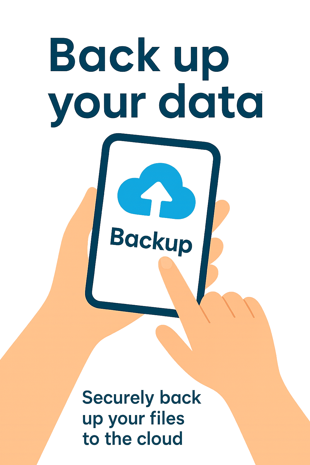 Illustrative graphic depicting a hand interacting with a tablet showing a cloud backup icon, ideal for promoting data security and backup services.