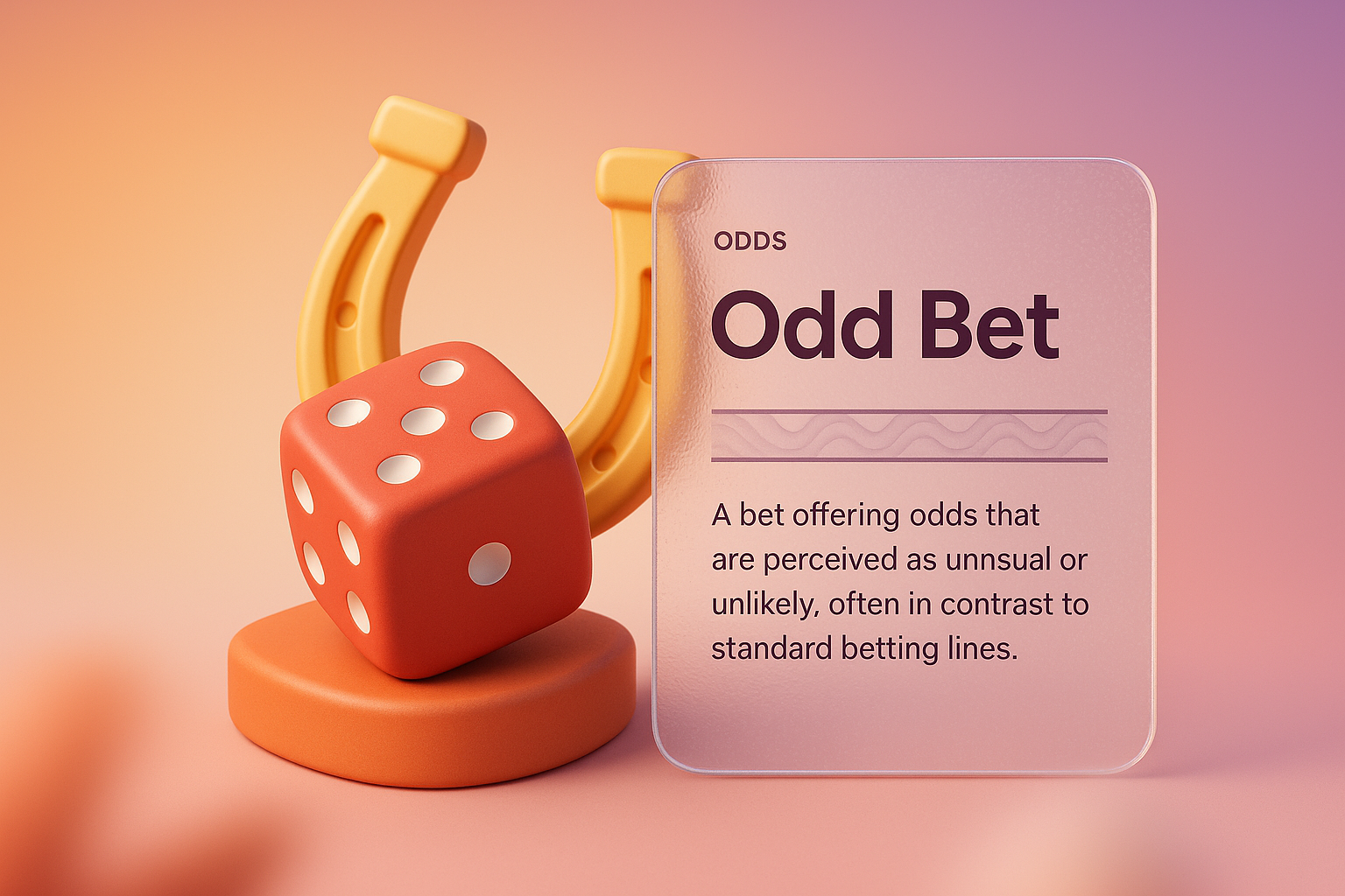 /Collection: /by davooda/Type: PNG/A vibrant 3D illustration featuring a dice and a horseshoe, symbolizing the concept of an odd bet. The design includes a transparent information block with a title and description, set against a smooth gradient background.
