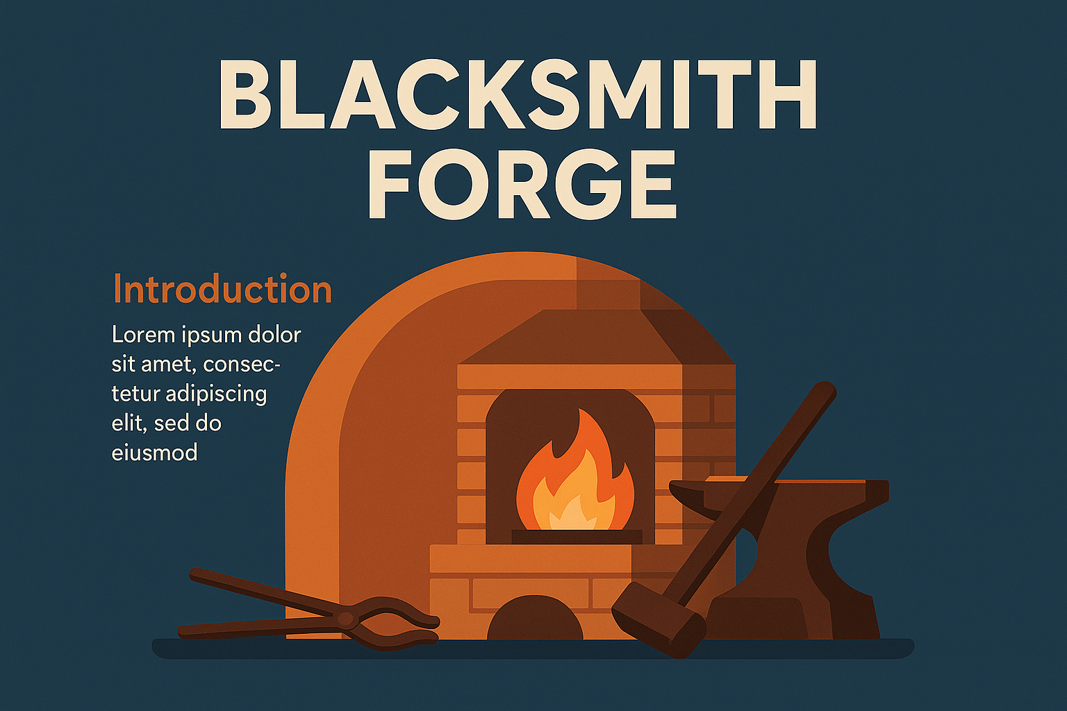 A visually engaging illustration of a blacksmith forge featuring a furnace, anvil, and tools. The design employs a three-color scheme with a modern layout.