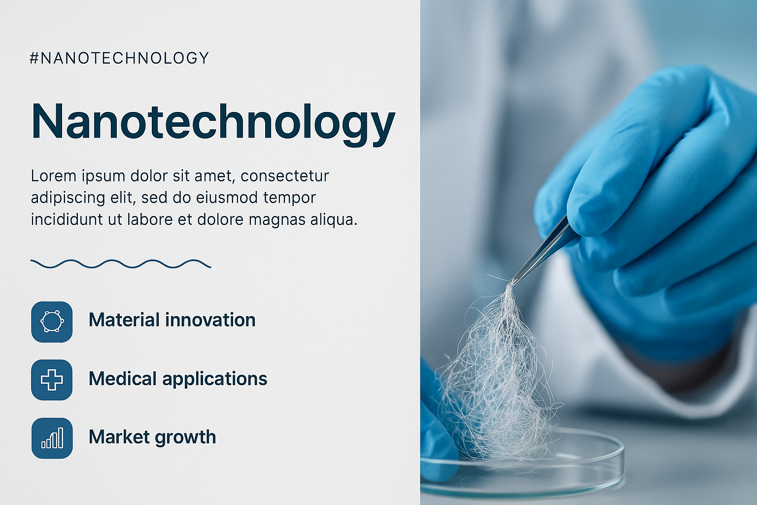 /Collection: /by davooda/Type: PNG/Professional infographic showcasing nanotechnology with a focus on material innovation, medical applications, and market growth. Ideal for educational or promotional use.