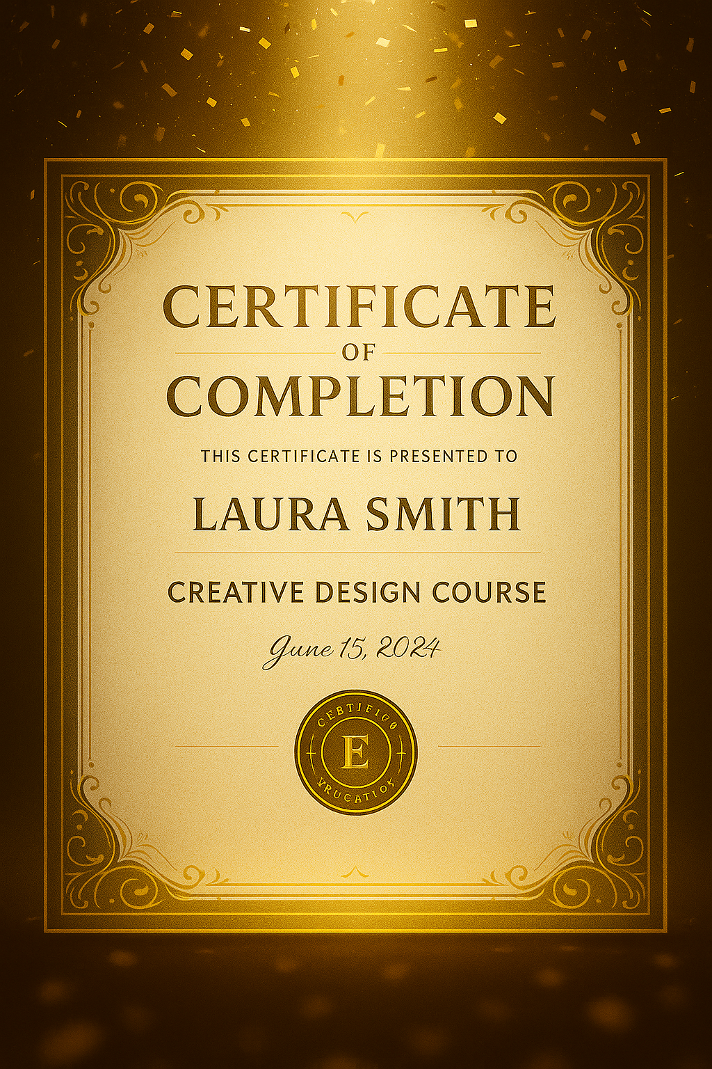 Stylish certificate of completion featuring ornate borders and a gold theme, ideal for educational achievements and recognition certificates.