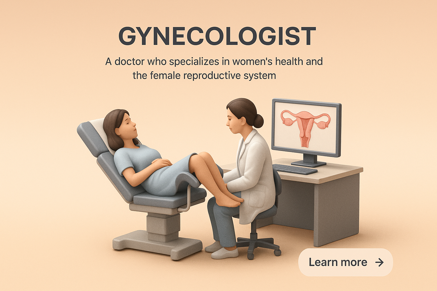 A realistic 3D illustration of a gynecologist consultation, featuring a doctor and patient in a medical setting. The design includes informative text and a call-to-action button.