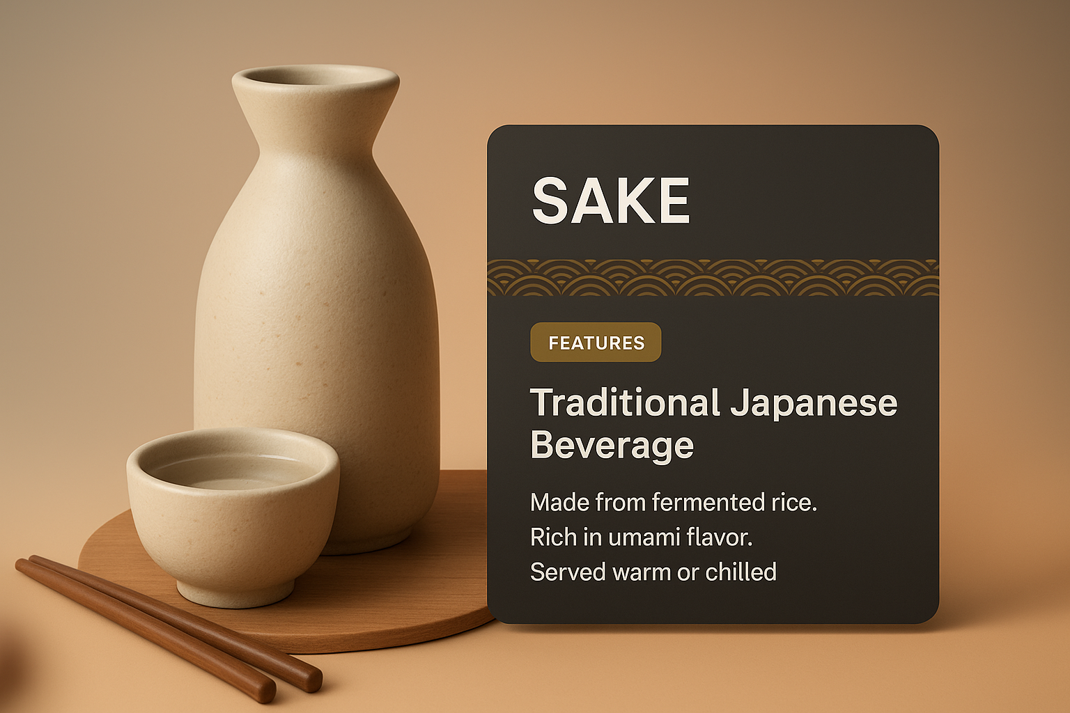 A beautifully arranged display of sake with a ceramic bottle and cup, featuring a stylish dark panel highlighting the beverage's characteristics in a warm gradient background.