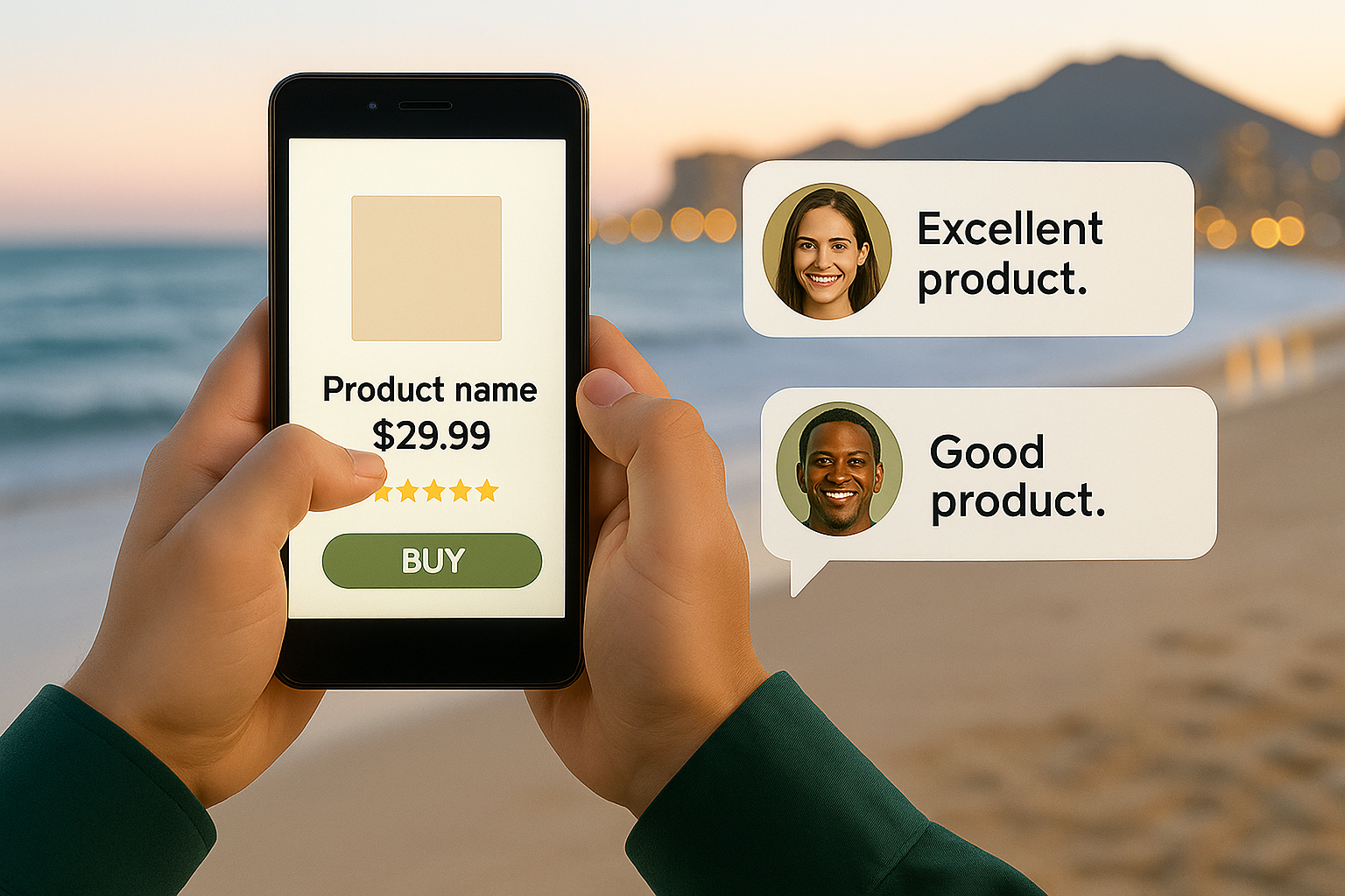 A mobile phone mockup displaying a product with user testimonials in speech bubbles, designed for e-commerce marketing and social proof.