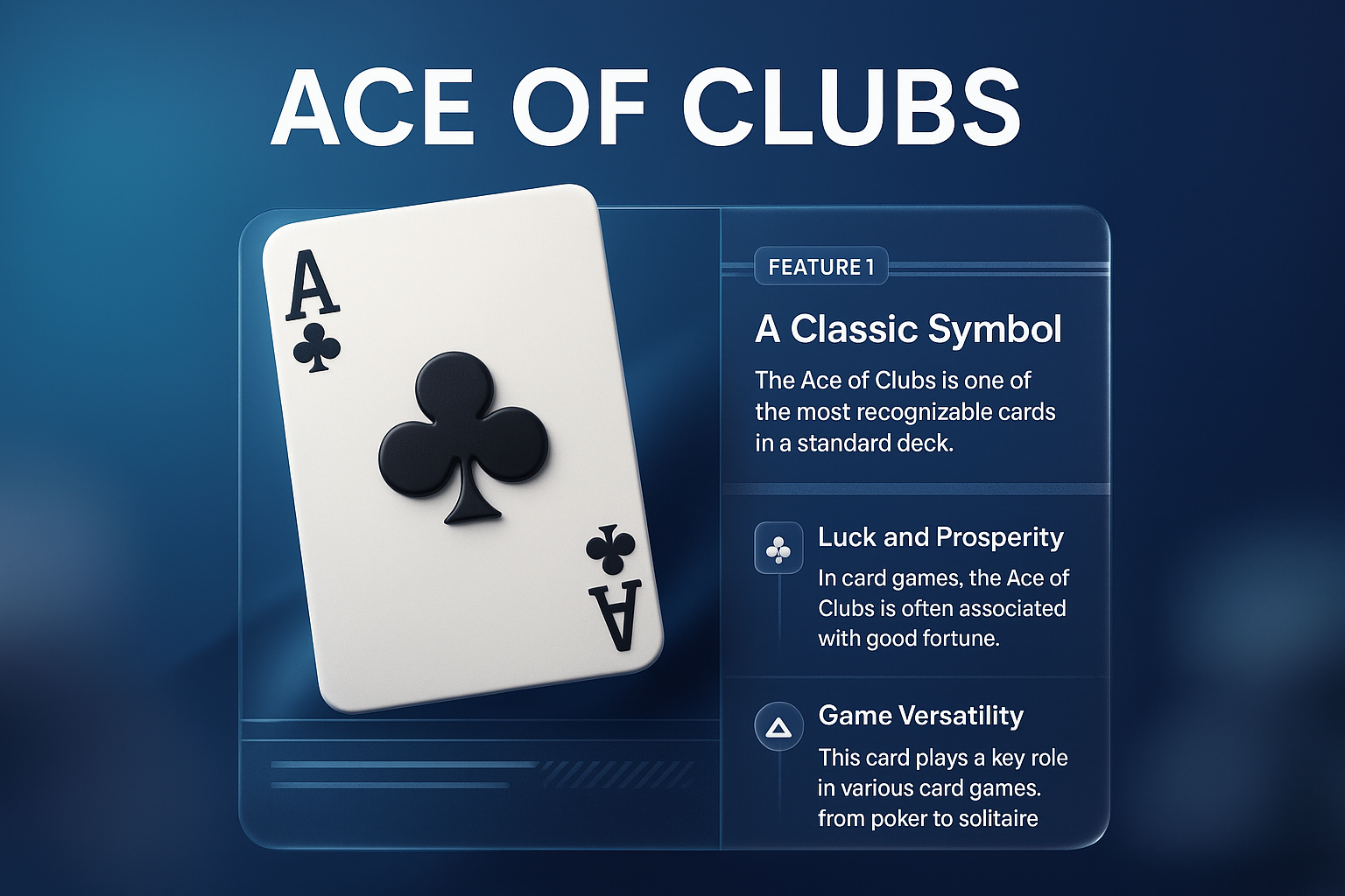 This image features a 3D illustration of the Ace of Clubs card, set against a smooth gradient background. The design includes informative blocks detailing the card's symbolism and versatility in games.