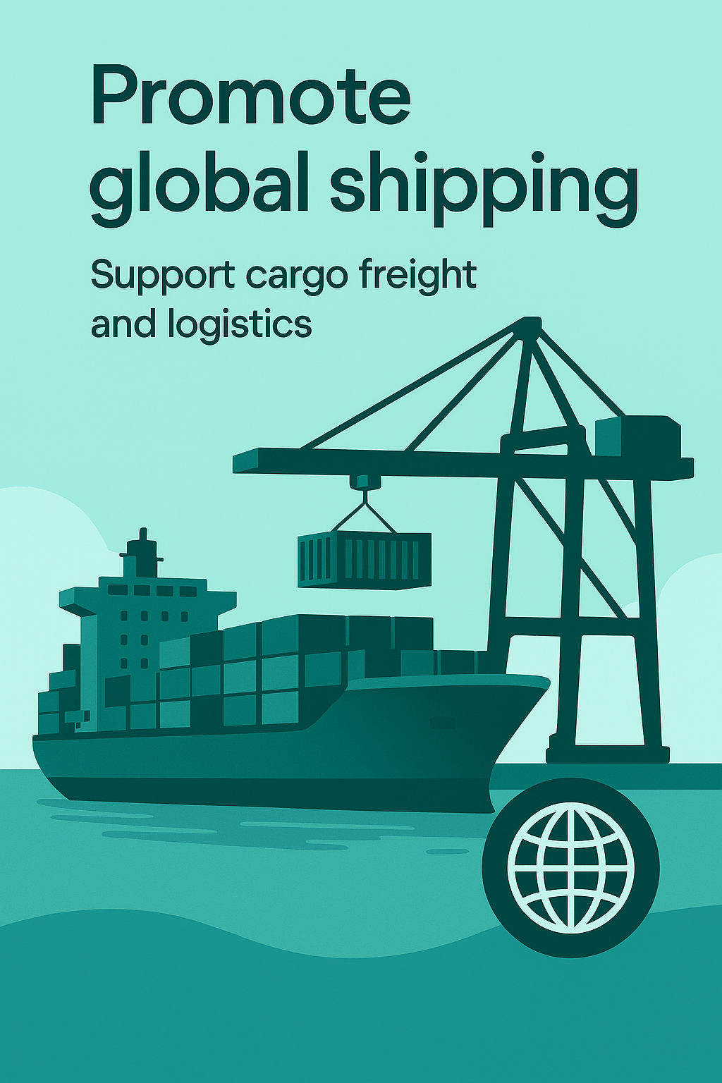 Illustrative graphic promoting global shipping services, featuring a cargo ship and crane. Ideal for logistics companies and maritime businesses.