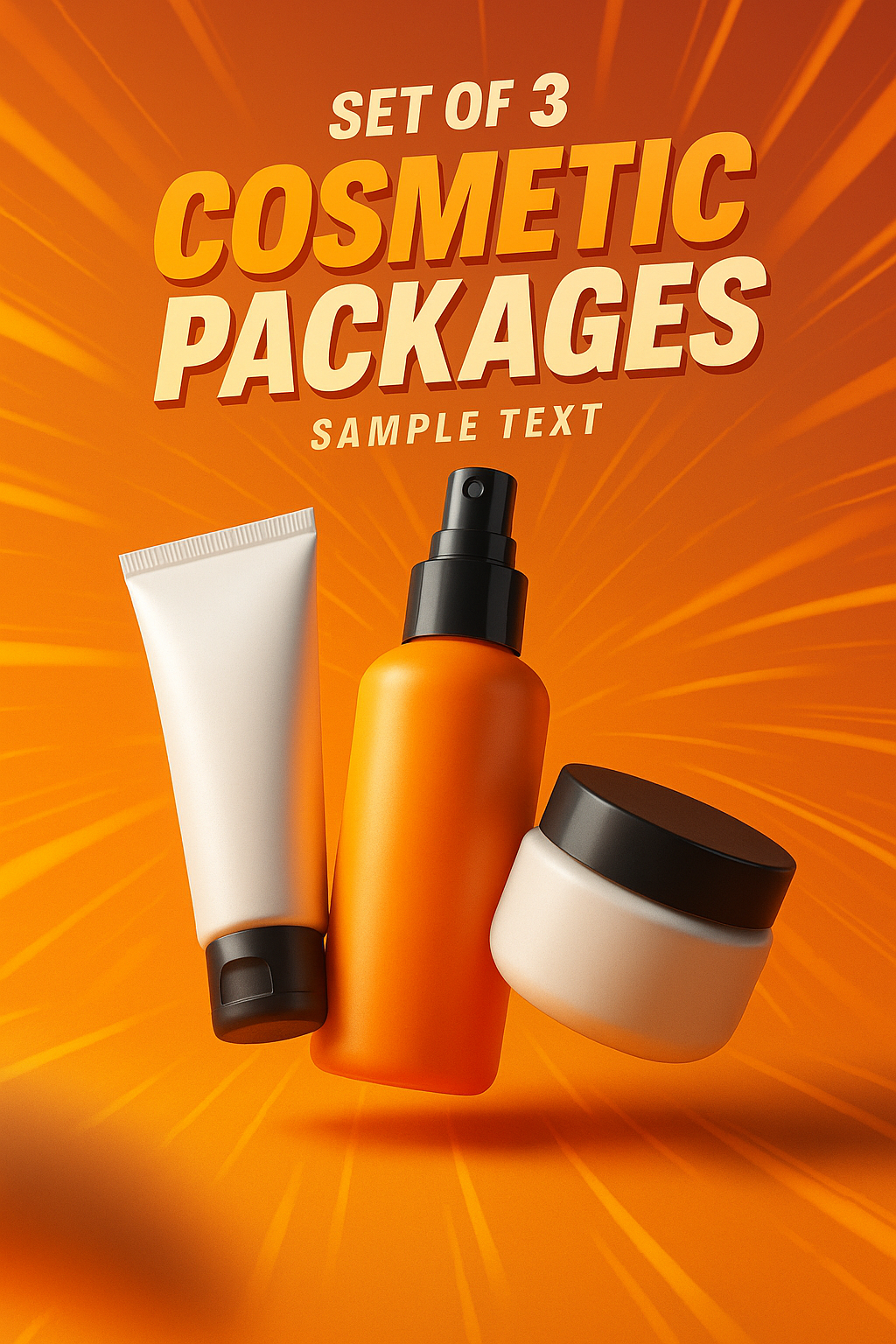 Dynamic Display of Three Cosmetic Packages on Vibrant Background