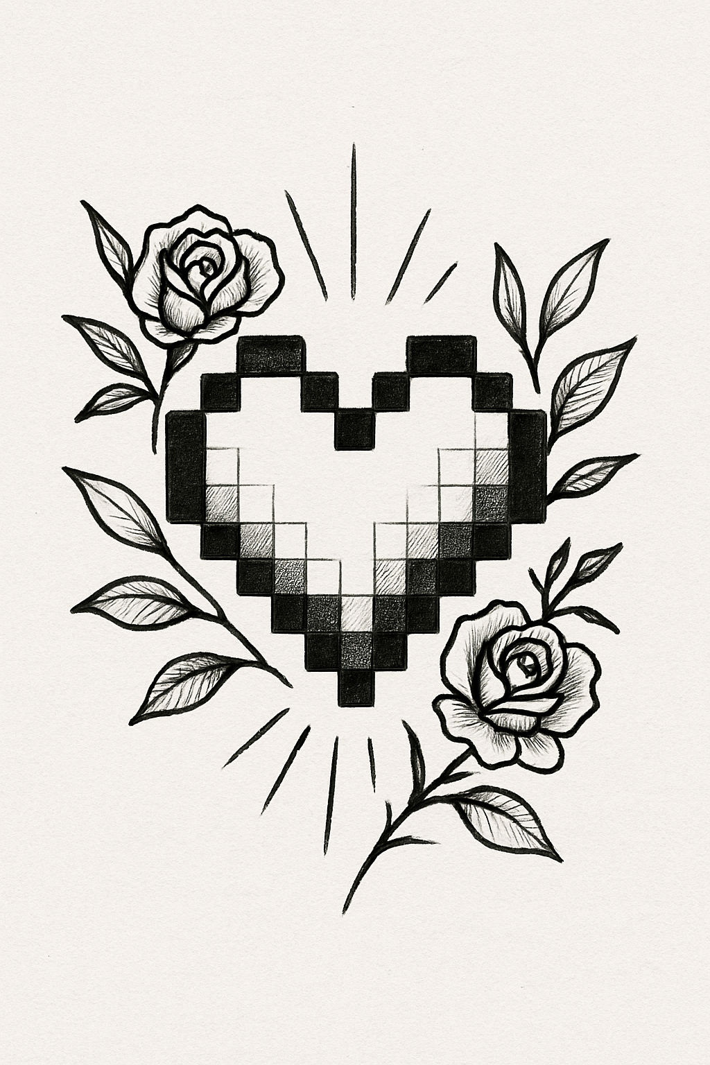 This image features a pixelated heart design surrounded by stylized roses. It combines digital art aesthetics with traditional sketch elements, ideal for art prints or tattoo designs.